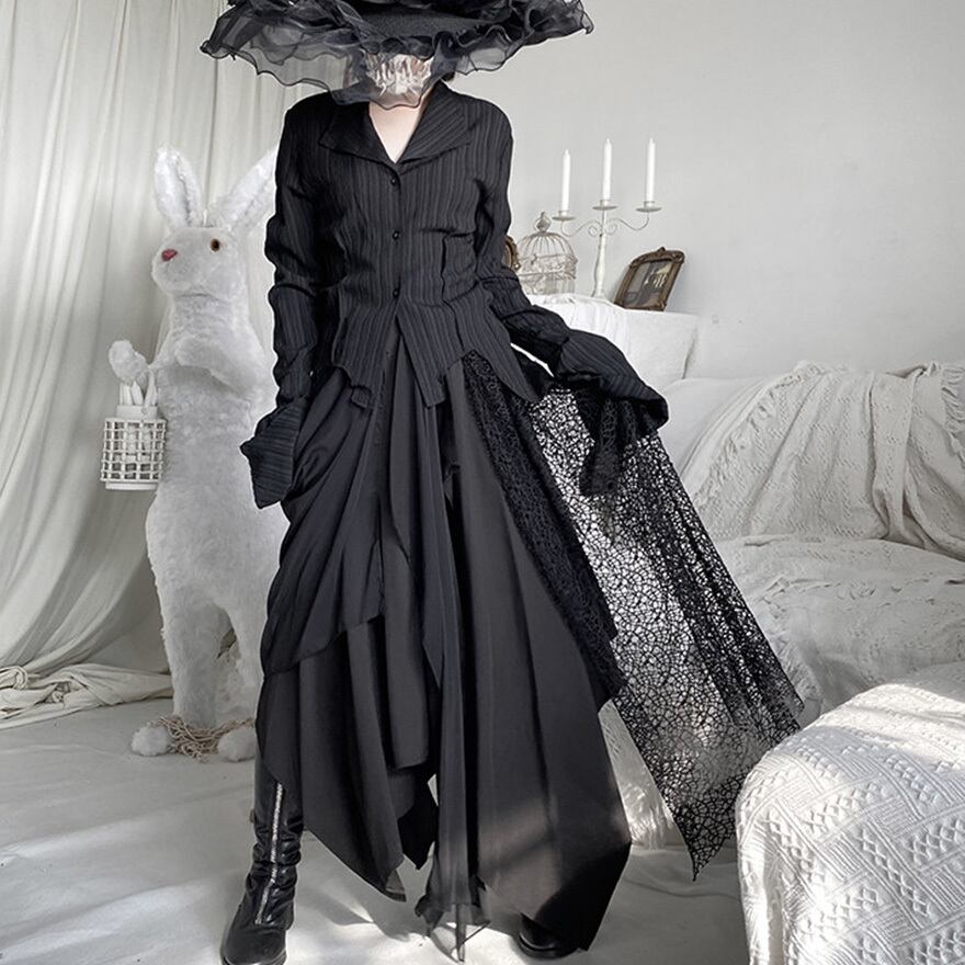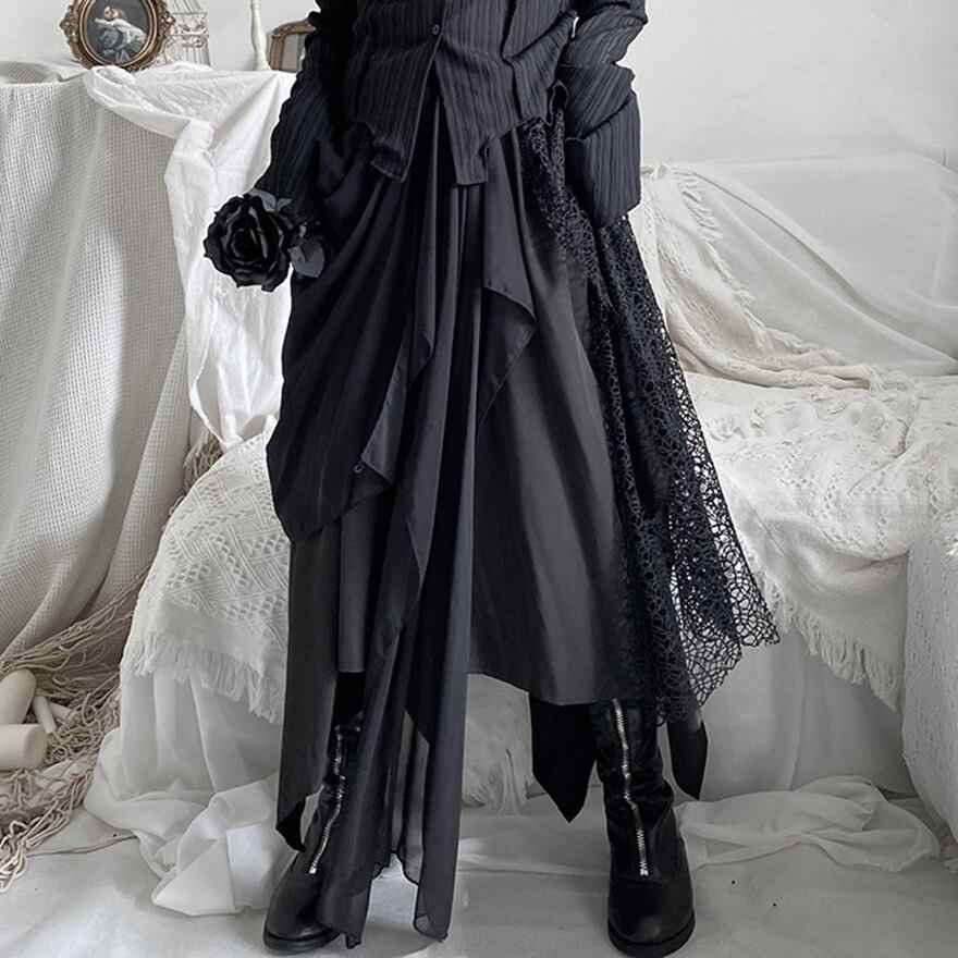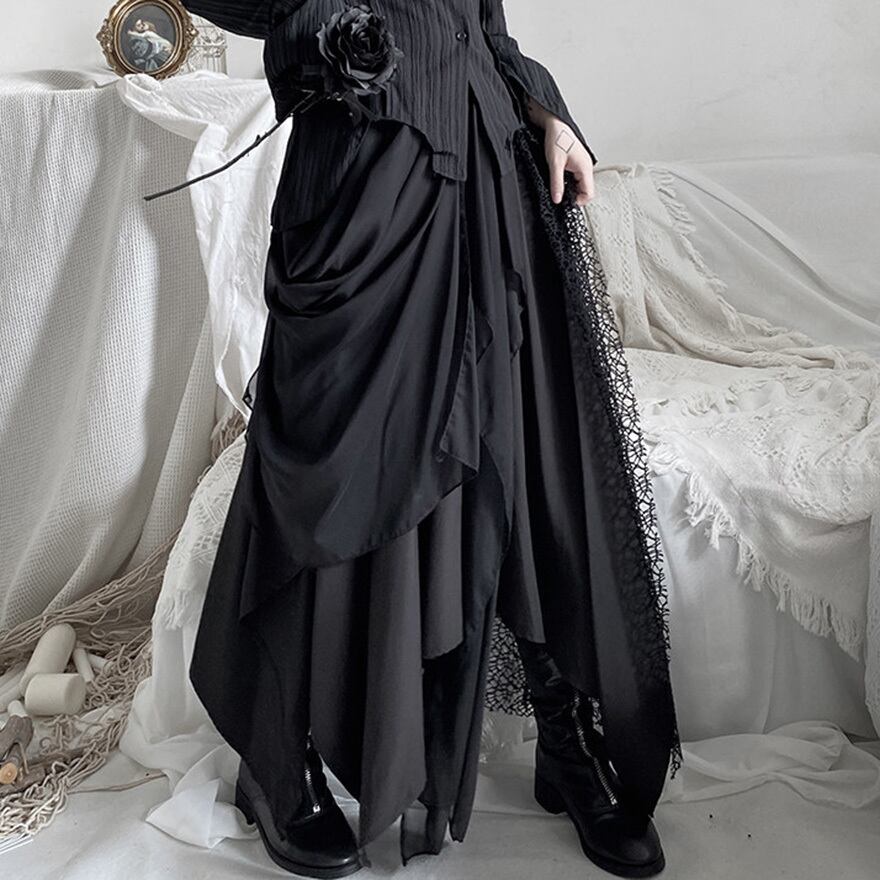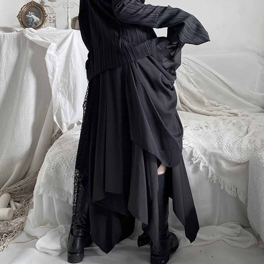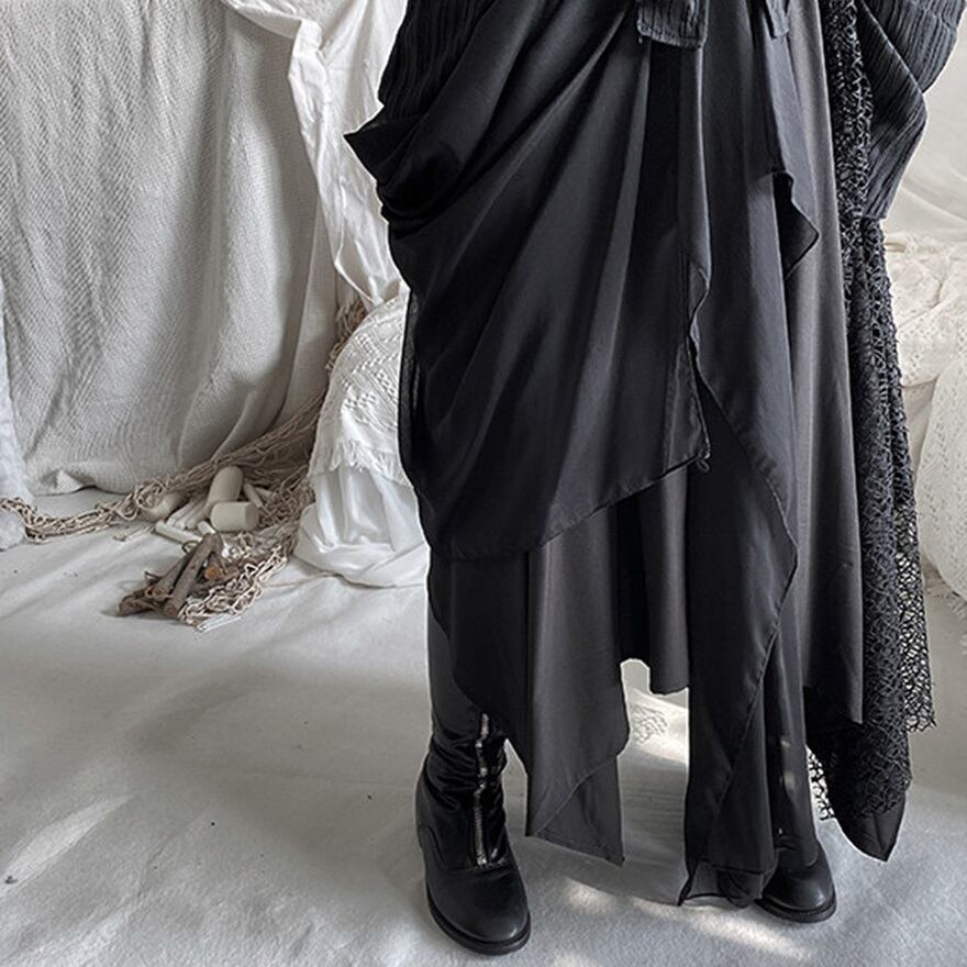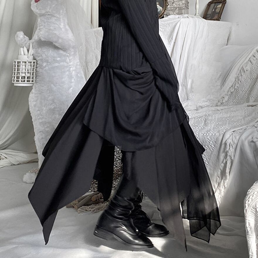ゴシックやダーク系ファッションを好む層に向けた、存在感のある一着です。歩くたびに不規則に揺れる裾が、ミステリアスな雰囲気を醸し出します。