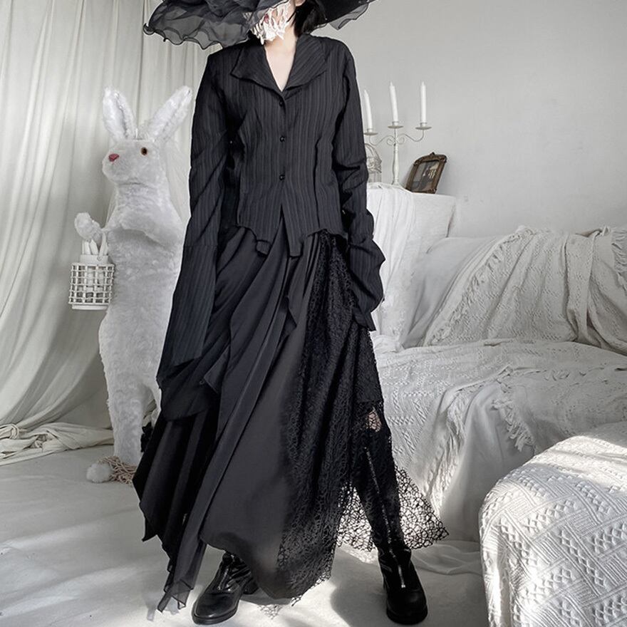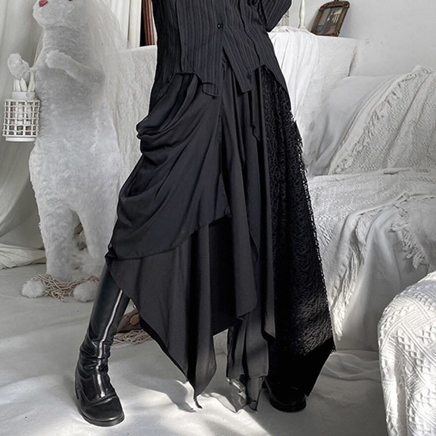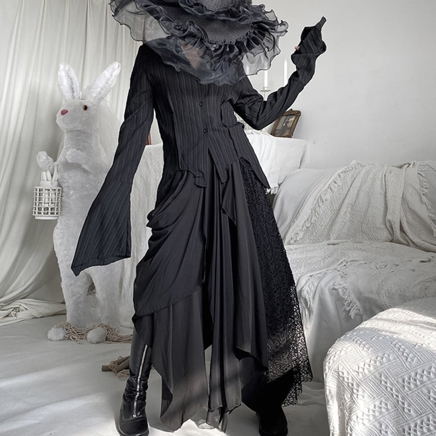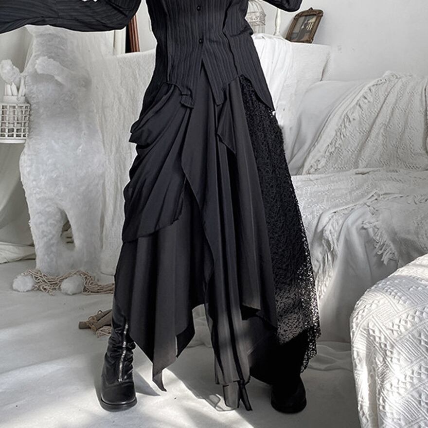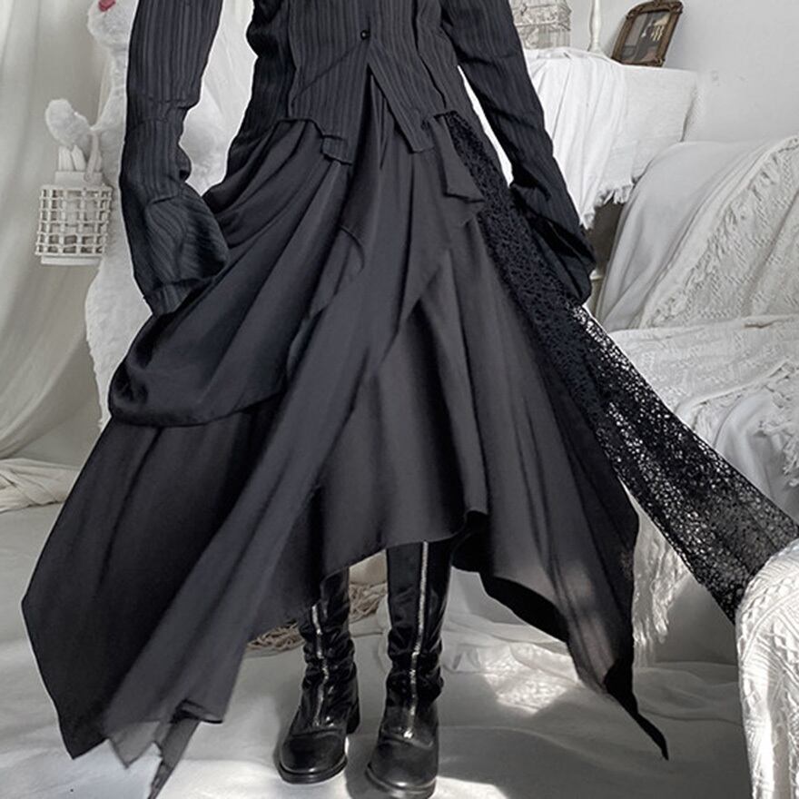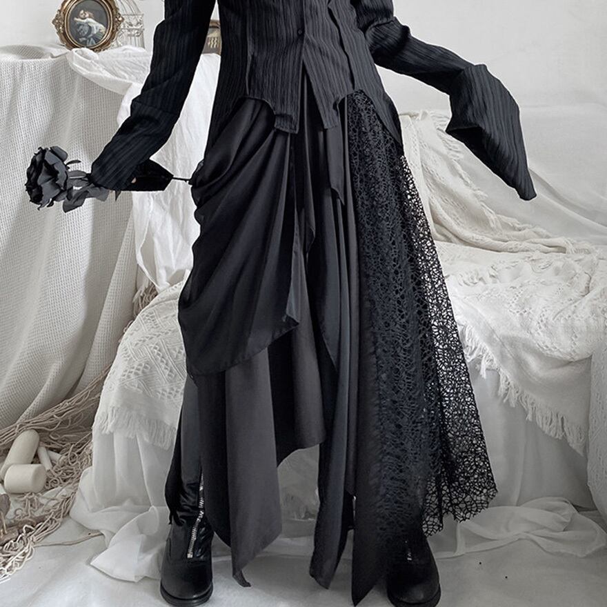 ゴシックやダーク系ファッションを好む層に向けた、存在感のある一着です。歩くたびに不規則に揺れる裾が、ミステリアスな雰囲気を醸し出します。
