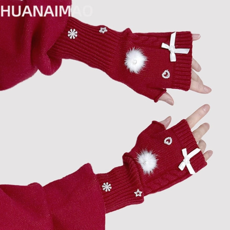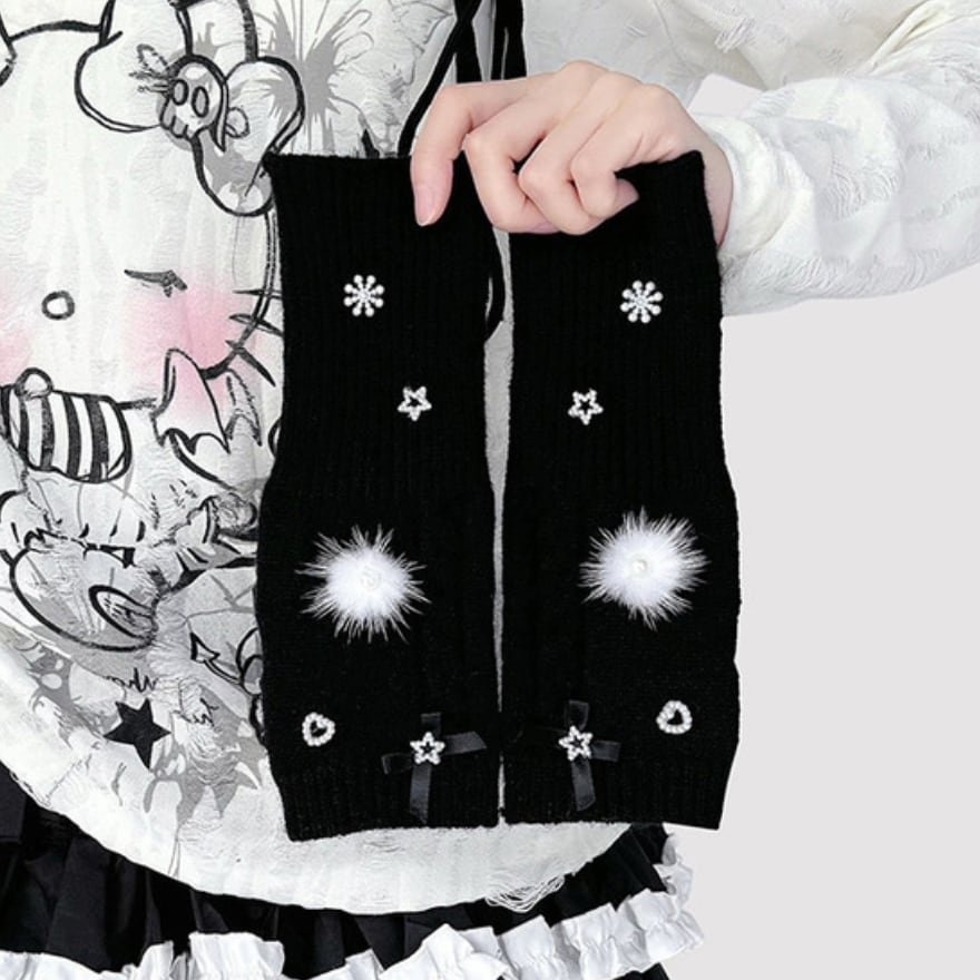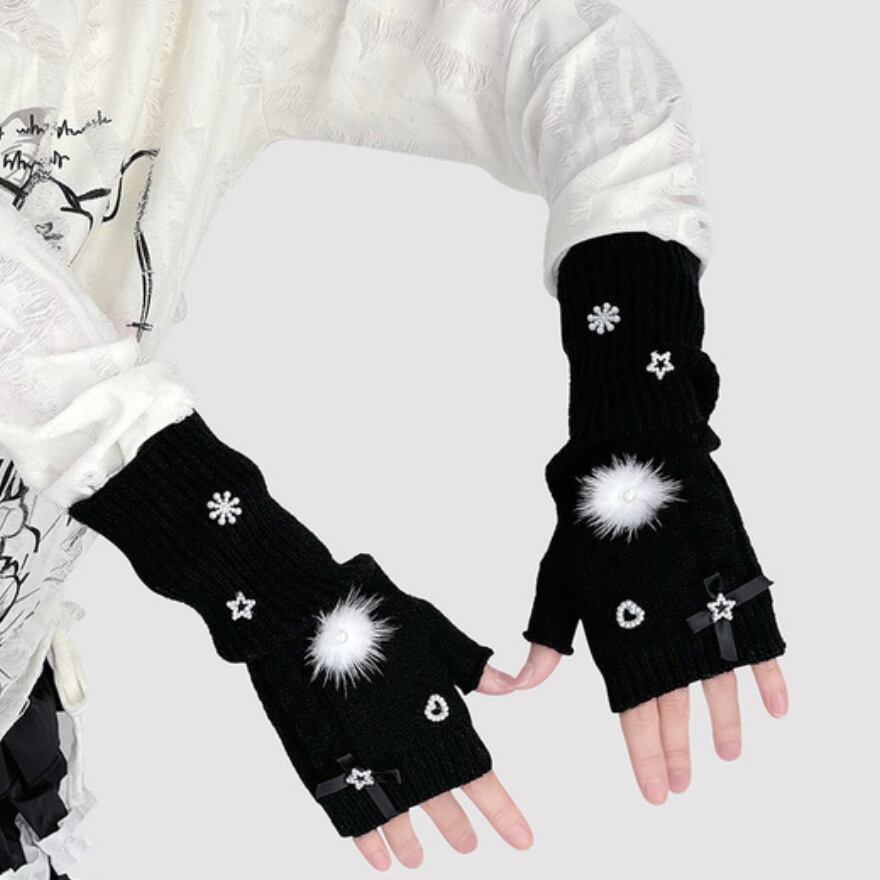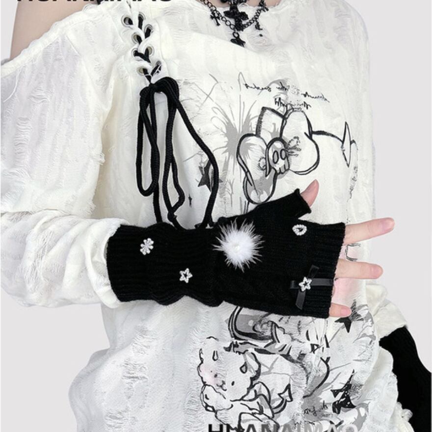 サブカル系コーデに取り入れやすい、露指仕様のニットハンドカバー(リボン装飾付き)|天使と悪魔