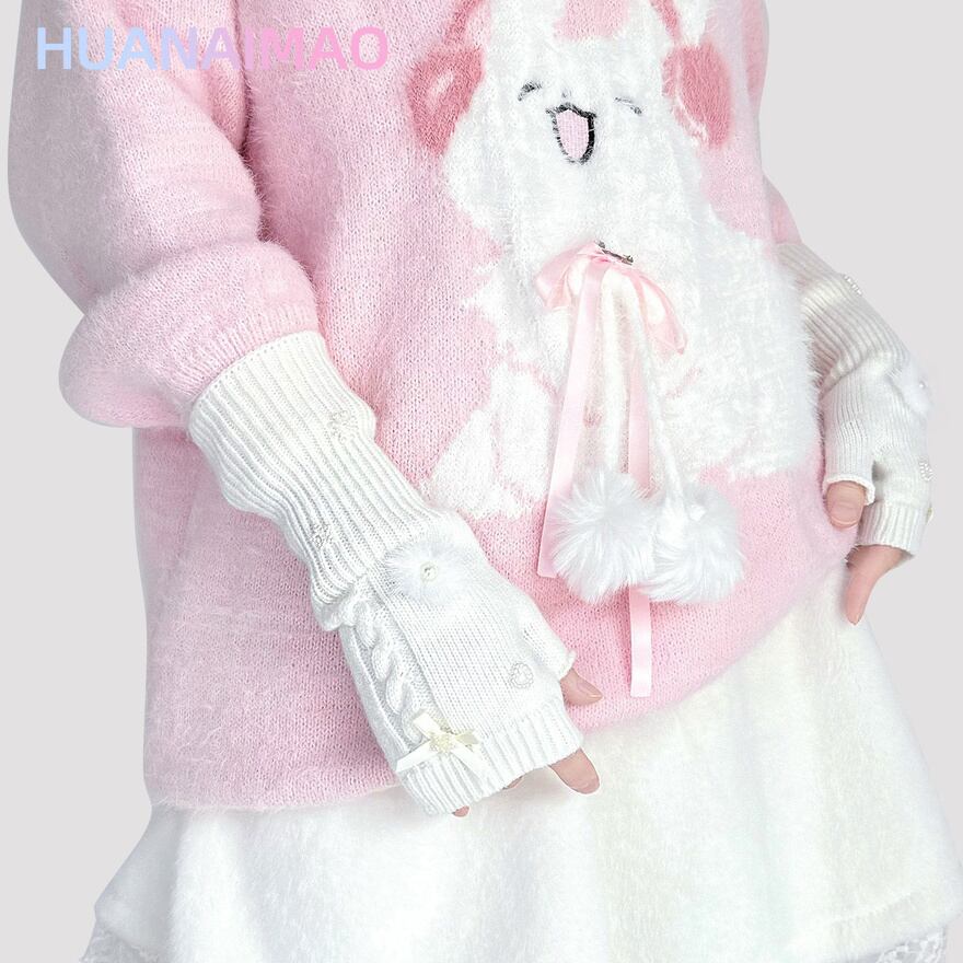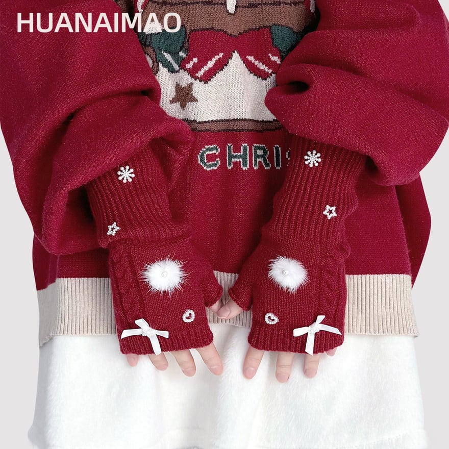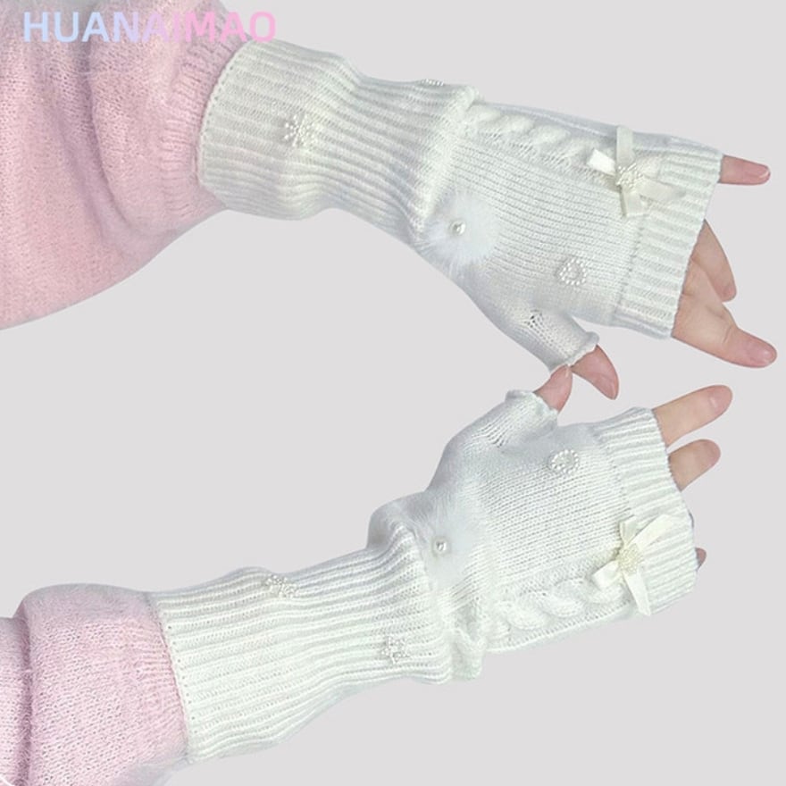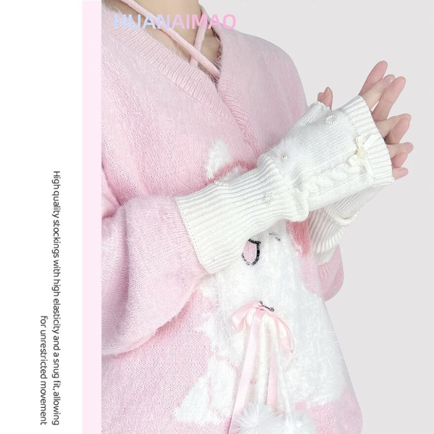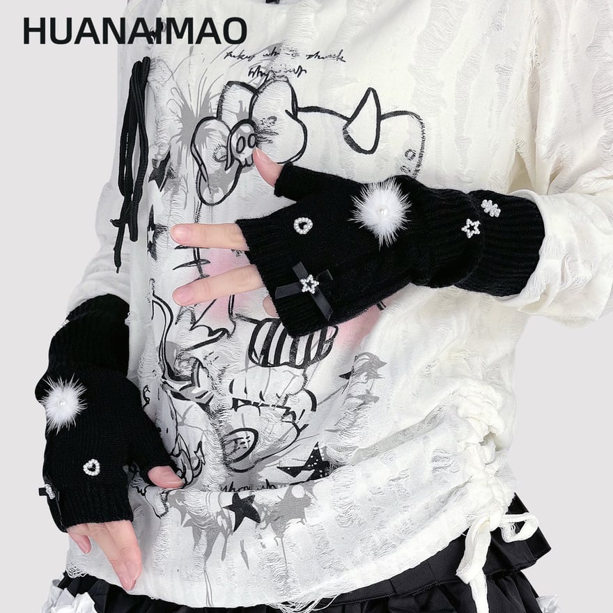 サブカル系コーデに取り入れやすい、露指仕様のニットハンドカバー(リボン装飾付き)|天使と悪魔