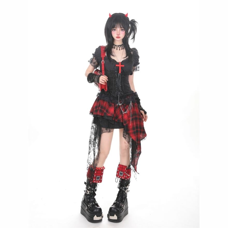 黒と赤の対比が明確な配色であり、シンプルな黒色のスカートやパンツと合わせるだけで、統一感のあるサブカル系のコーディネートが容易に完成します。前面の編み上げは装飾として機能し、視線を中央に集める構造になっています。