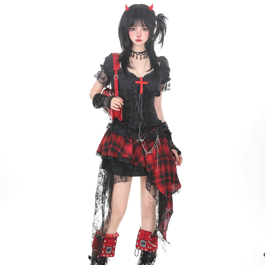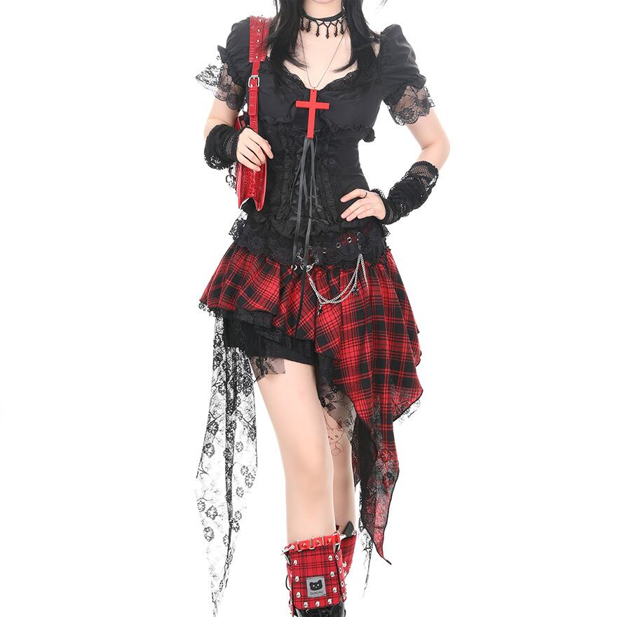 サブカル系ジャンルの半袖トップスです。黒色を基調とし、中央の鮮やかな赤色の十字架装飾と、コルセットを模した前面の編み上げが視覚的な特徴となっています。袖口や襟元に施されたレースとフリルが華やかさを演出し、イベントや撮影、個性的な日常の装いとして活用できる一着です。