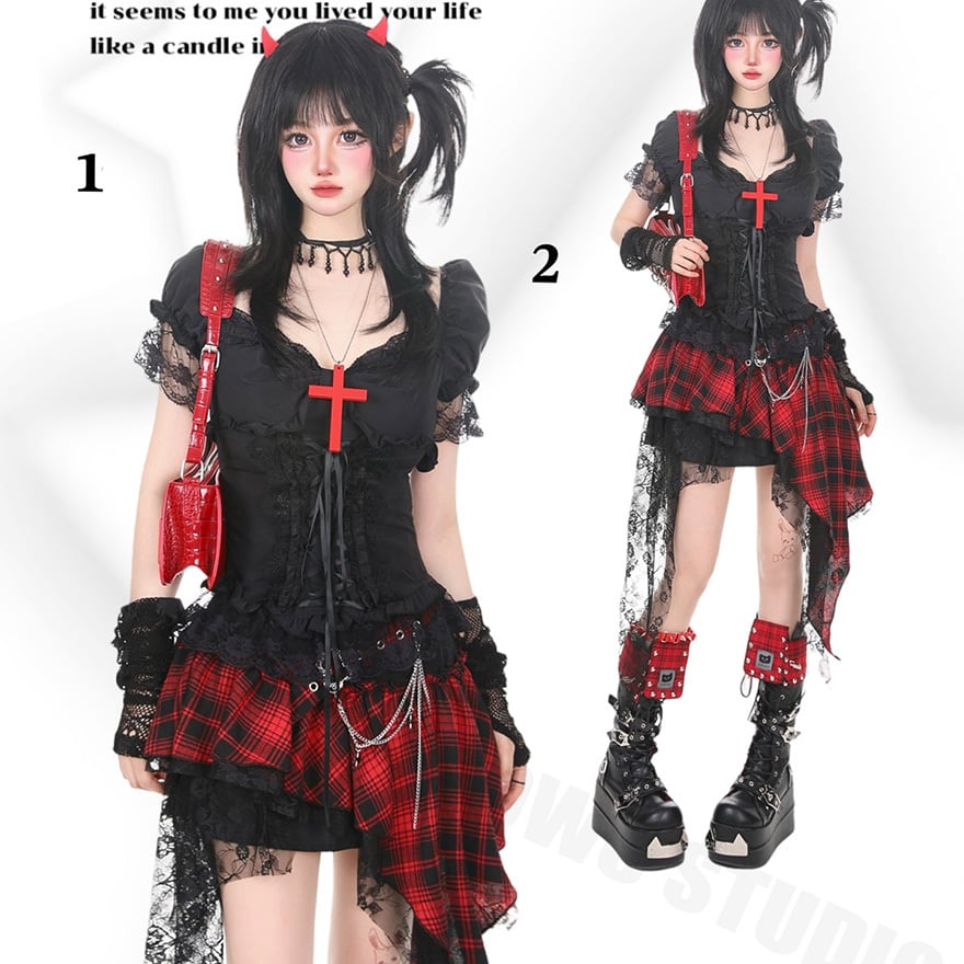 赤十字モチーフが映えるゴシックトップス|レース×フリルで魅せるサブカル系ブラックトップス|天使と悪魔