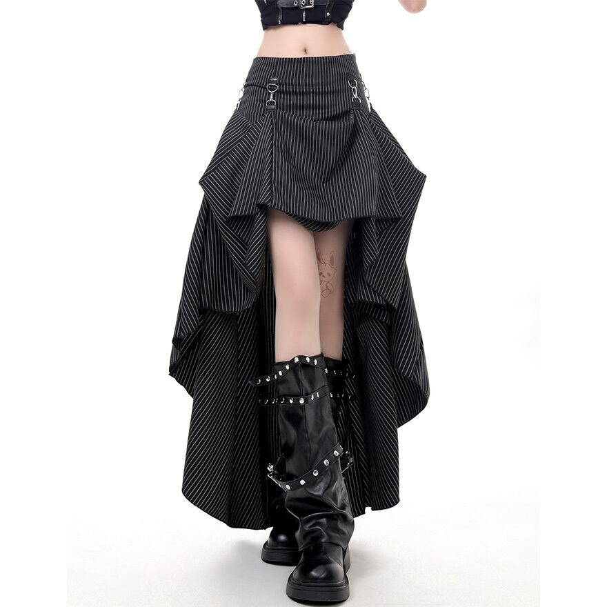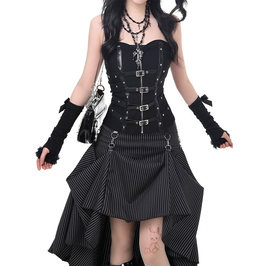 ゴシック寄りなジャンルのベアトップ型トップスと前後の着丈が異なるヘム丈スカートのセットアップです。