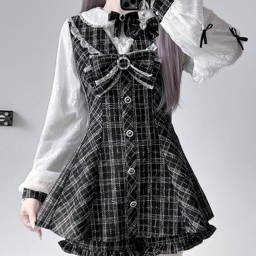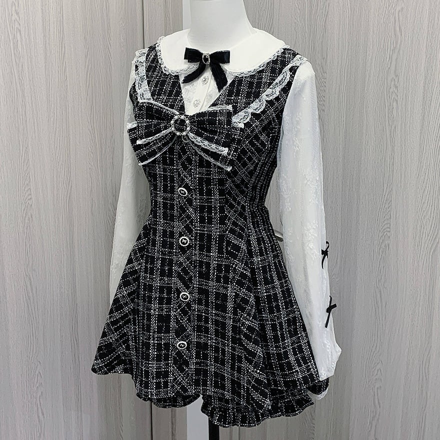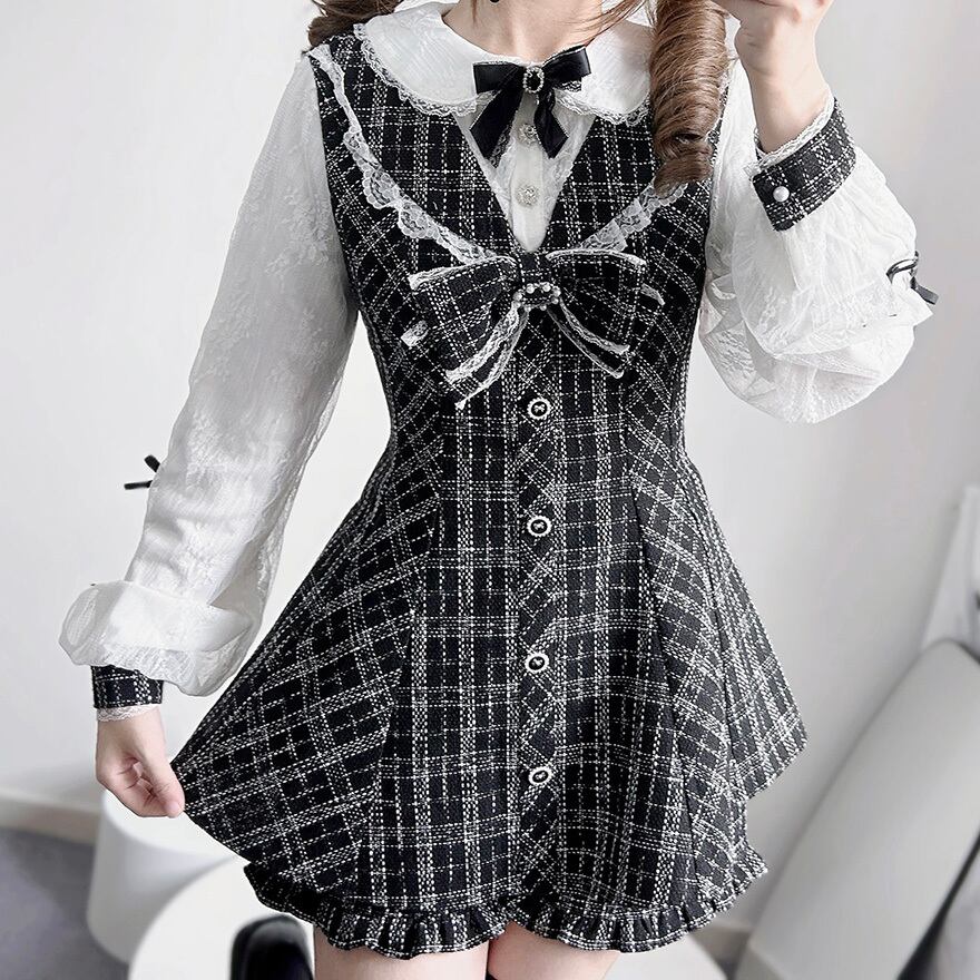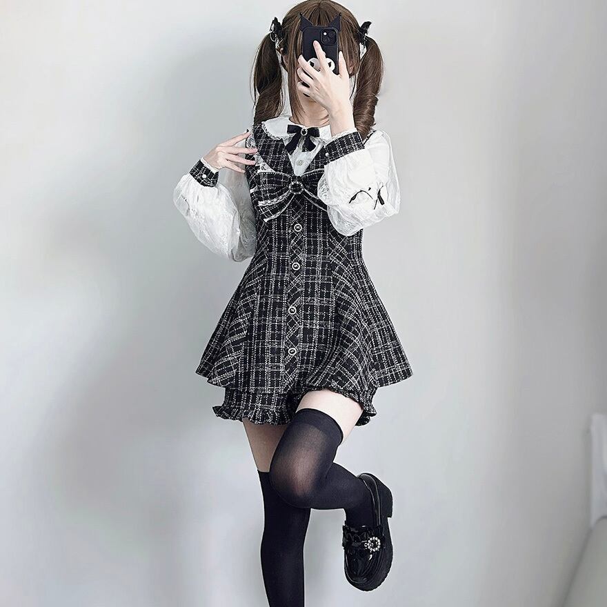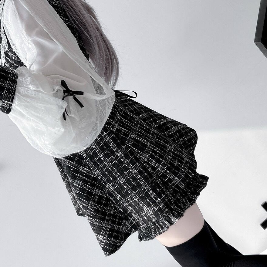 クラシカルチェック柄 レース袖ブラウス×ミニワンピース 上下セットアップ|ゴシック・量産型対応|天使と悪魔