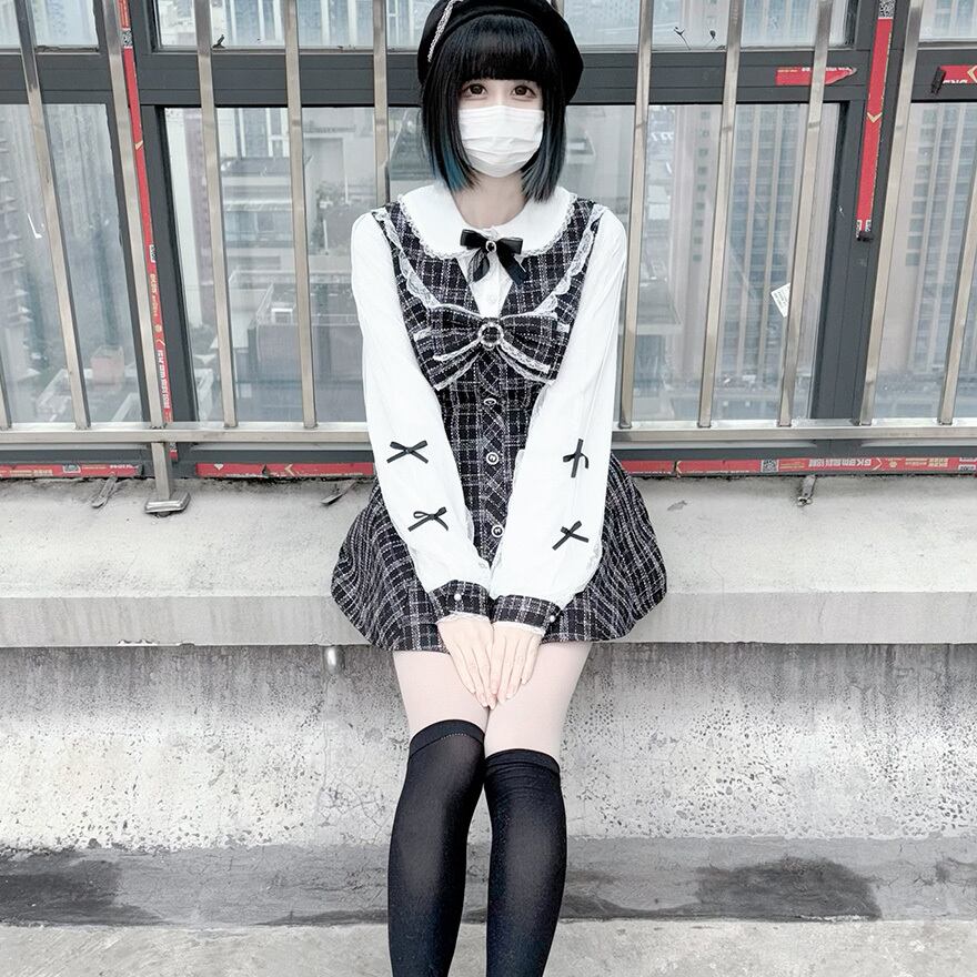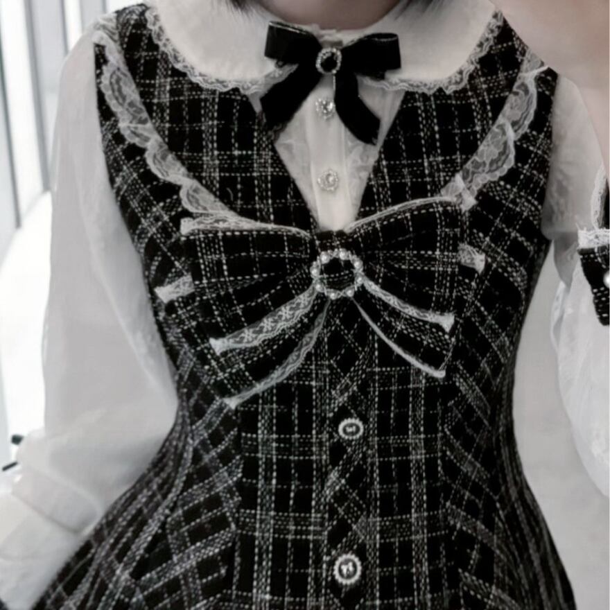 黒と白の格子柄を基調としています。上着の袖部分は白いレース素材で、小さな黒いリボンが等間隔に配置されています。