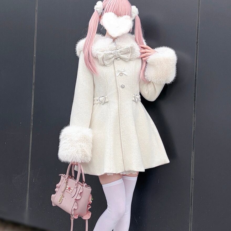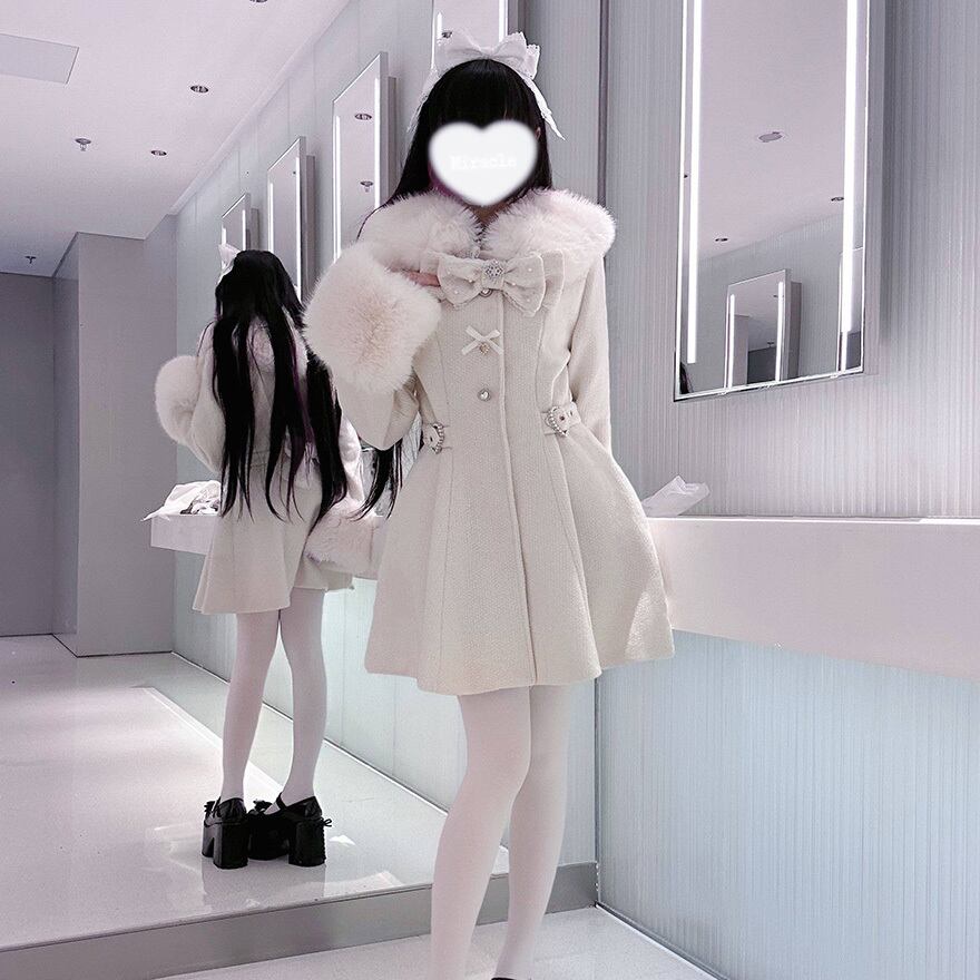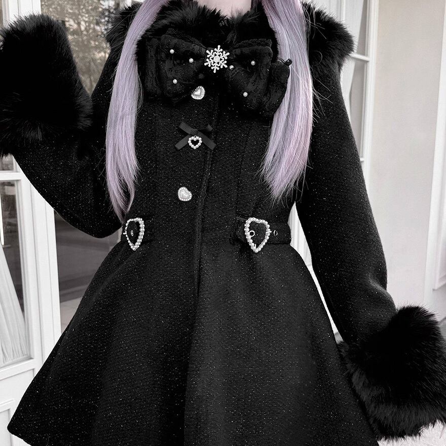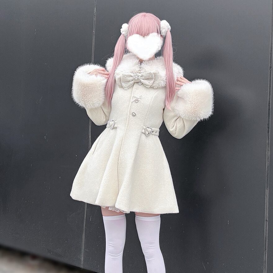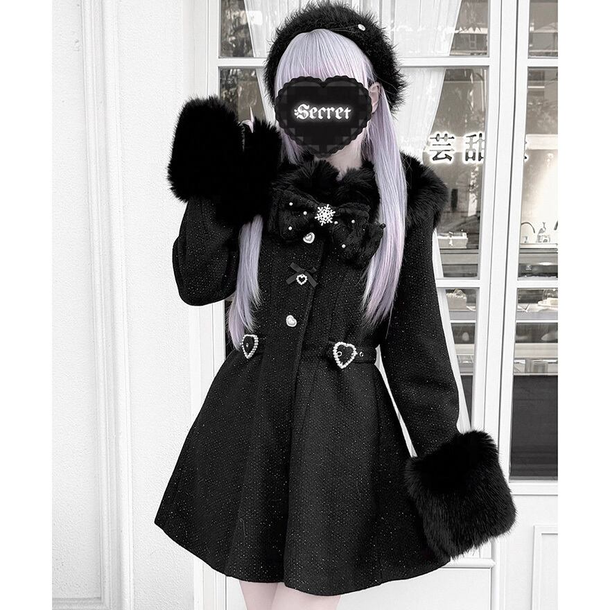 地雷系ジャンルの冬用アウターです。首元と袖口にボリュームのあるファーを配し、胸元には雪の結晶のような装飾を添えた大ぶりのリボンを配置。