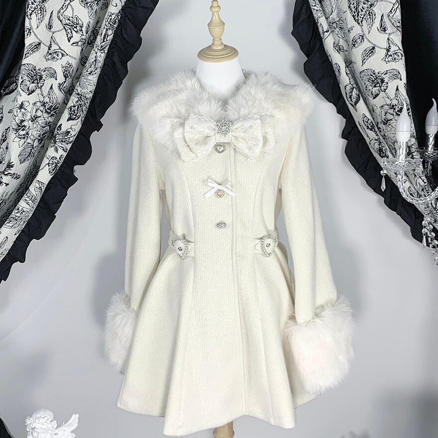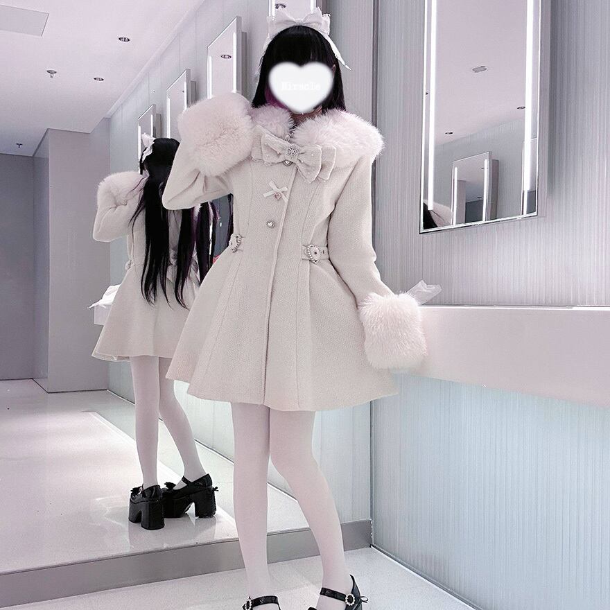 ファー付きリボン装飾 ロリータ調ロングコート|甘ゴシック・地雷系対応 冬用アウター|天使と悪魔