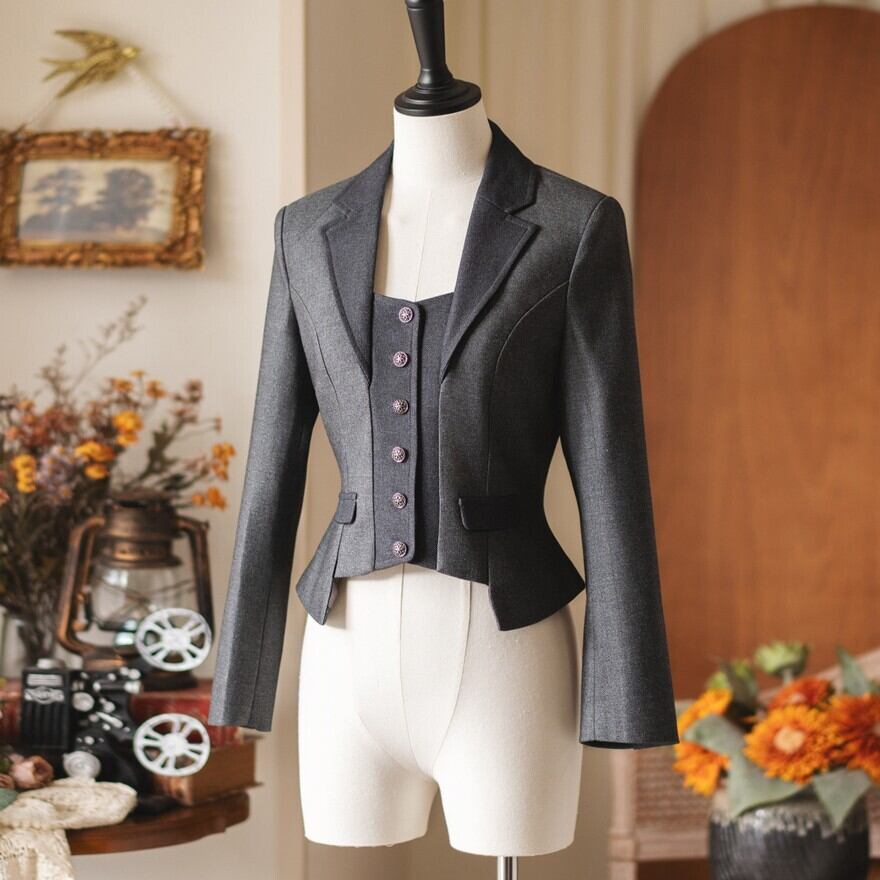 気品漂うダークグレーのクラシカルなショートジャケットです。ウエストを絞った立体的なカッティングと、裾のペプラム風のデザインが美しいシルエットを描きます。フロントには装飾的なボタンを配し、ベストを重ね着したようなレイヤード風の仕立て。ヴィンテージ感のある上品な装いを叶える一着です。