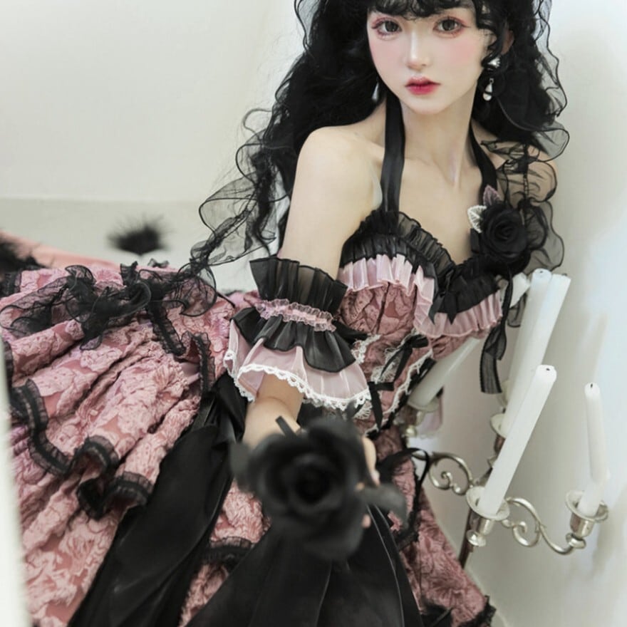地雷系や量産型コーデの完成度を格段に高める、黒リボンのチョーカーと手袖(ハンドスリーブ)のアクセサリーセットです 。繊細なレースをあしらった手袖と、中央にリボンが配されたチョーカーが、首元と手元を華やかに彩ります。お手持ちのワンピースにプラスするだけで、SNS映えするドールのような世界観を演出できるアイテムです 。