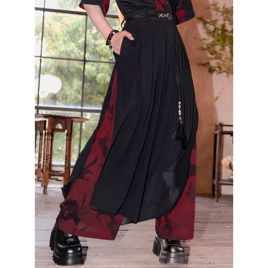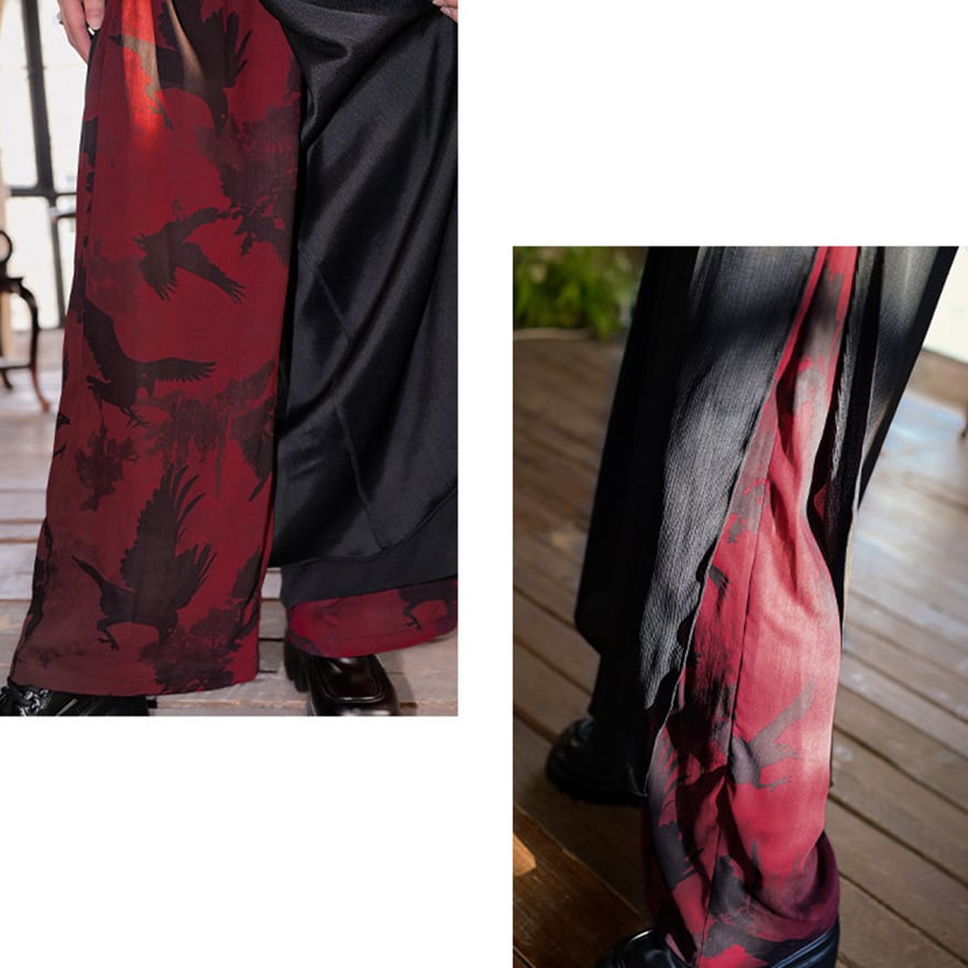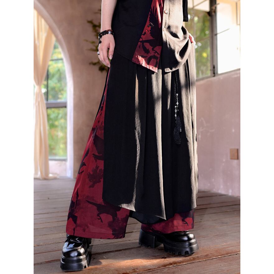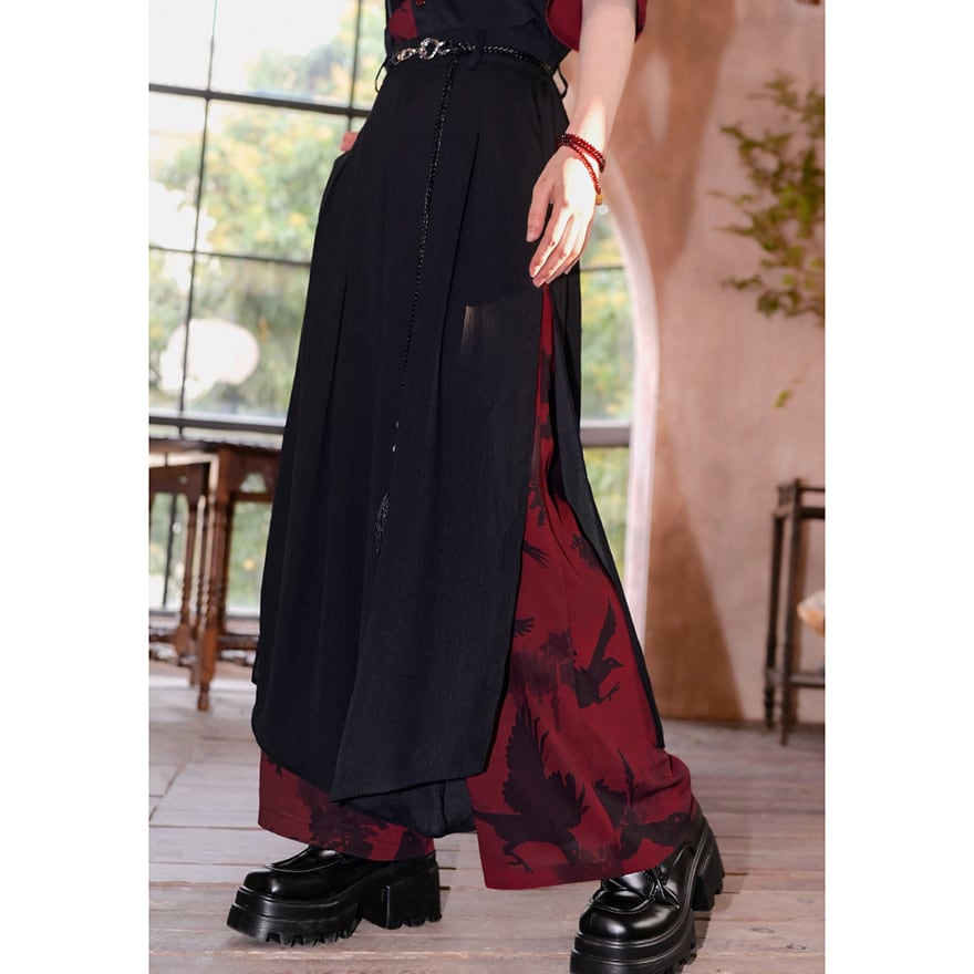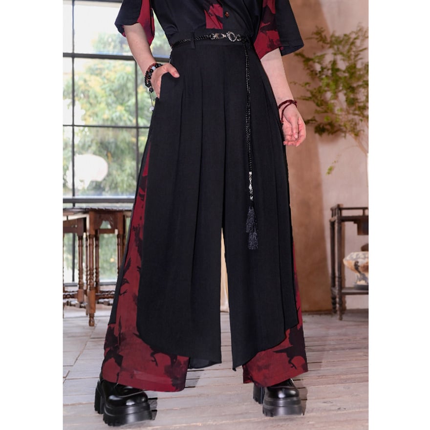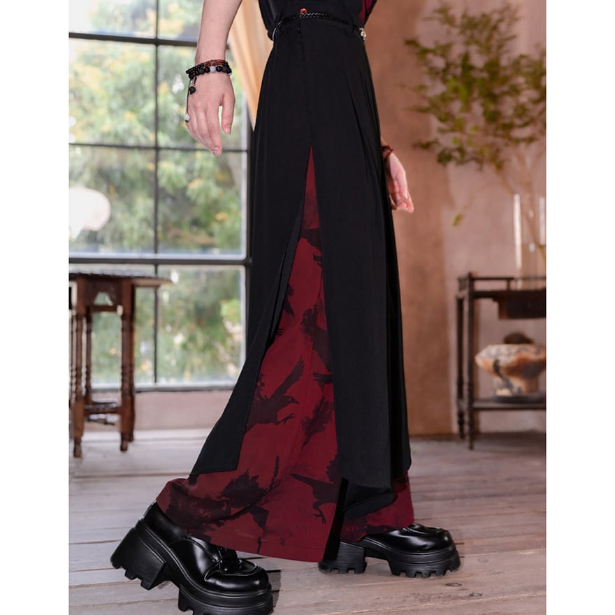 中華ゴシックジャンルのワイドパンツです。黒の無地生地と、赤地に鴉のシルエットが描かれたプリント生地を重ねた二層(レイヤード)構造が特徴です。