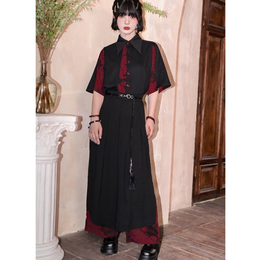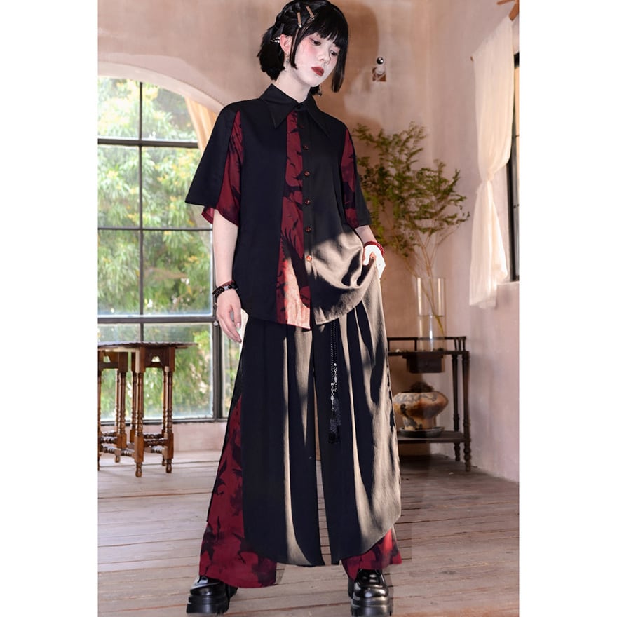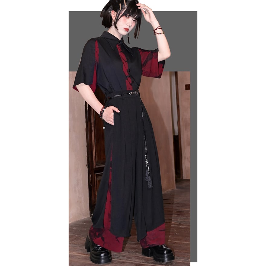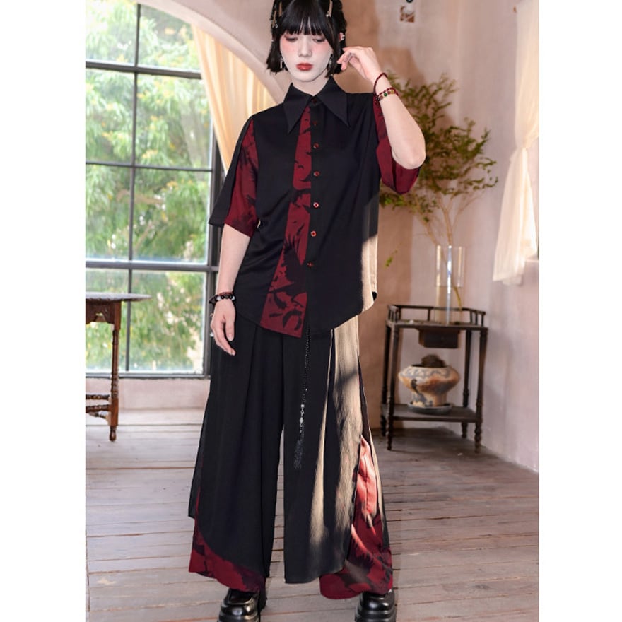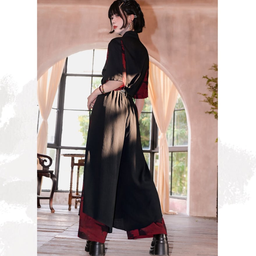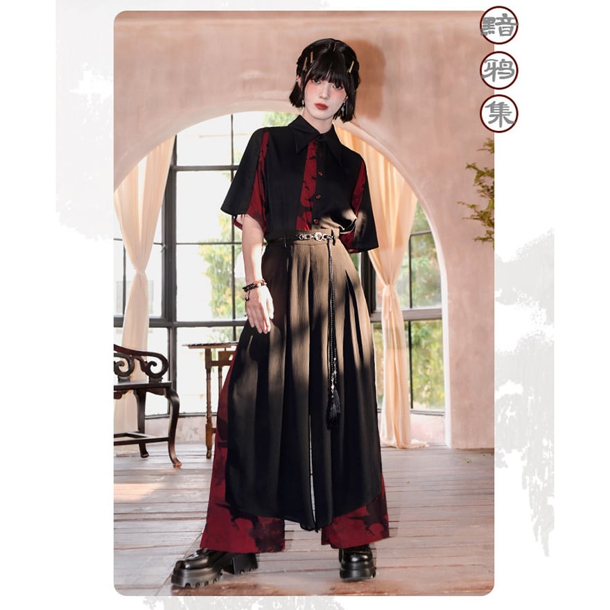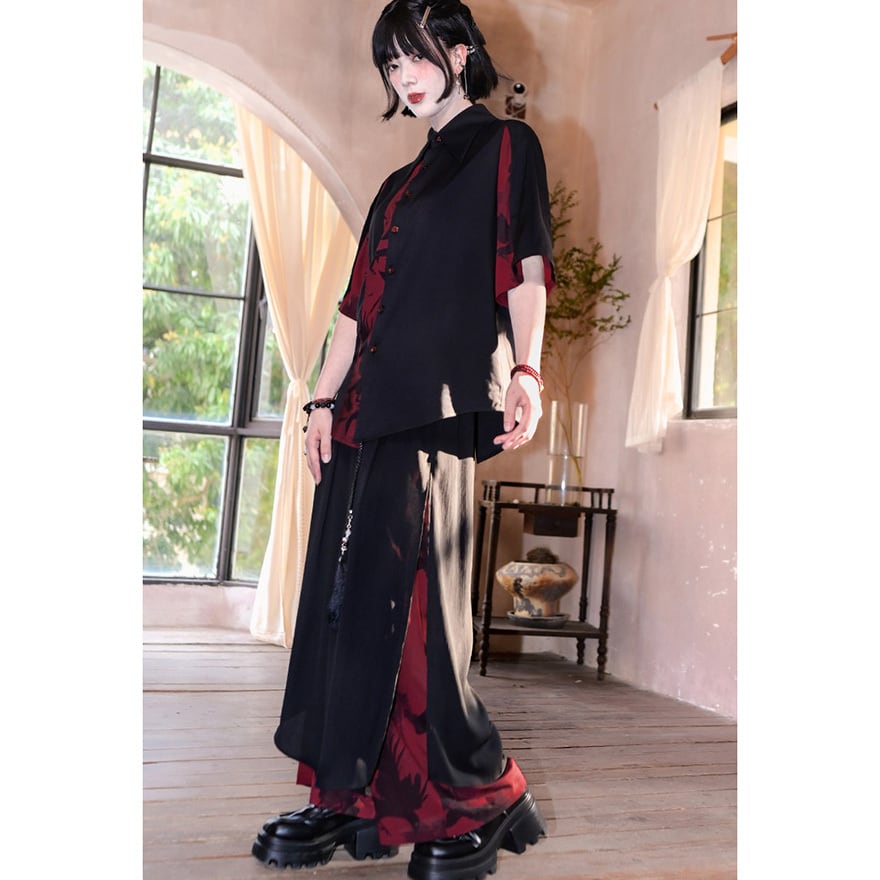 中華ゴシックジャンルのワイドパンツです。黒の無地生地と、赤地に鴉のシルエットが描かれたプリント生地を重ねた二層(レイヤード)構造が特徴です。