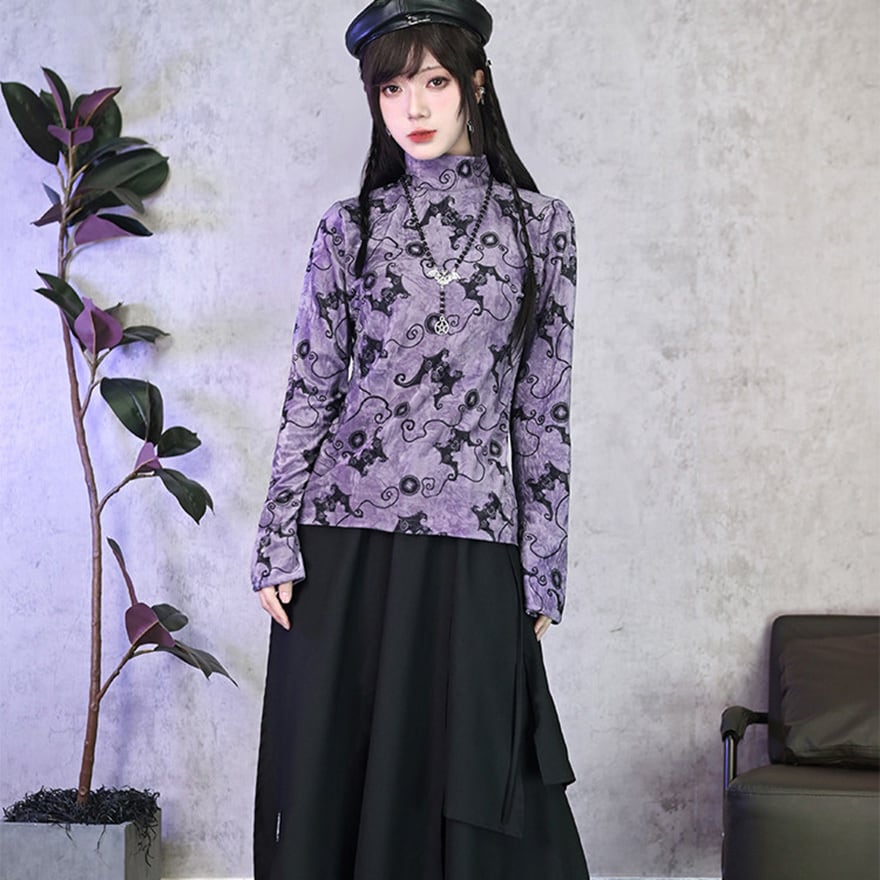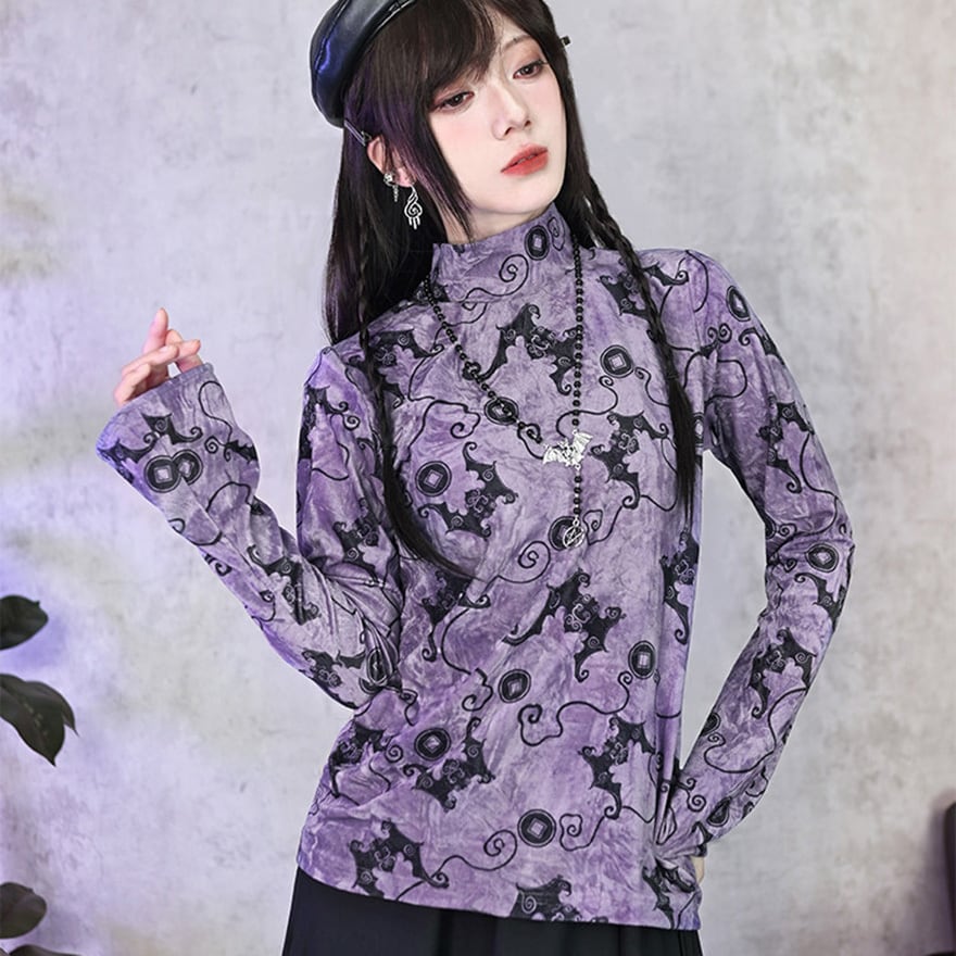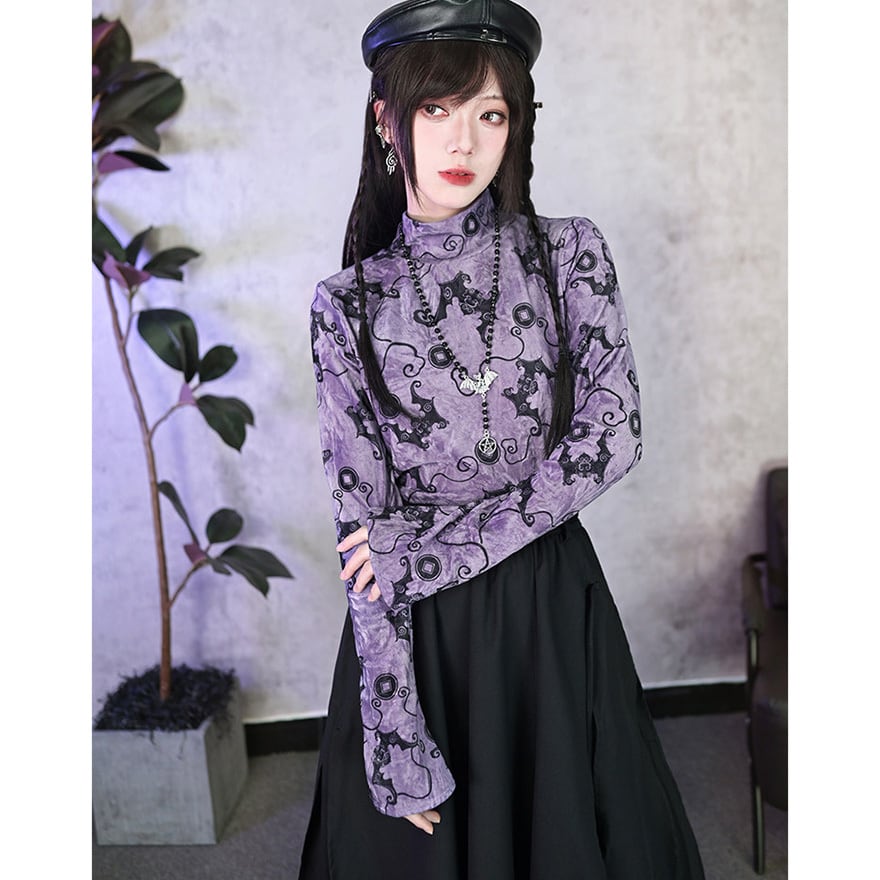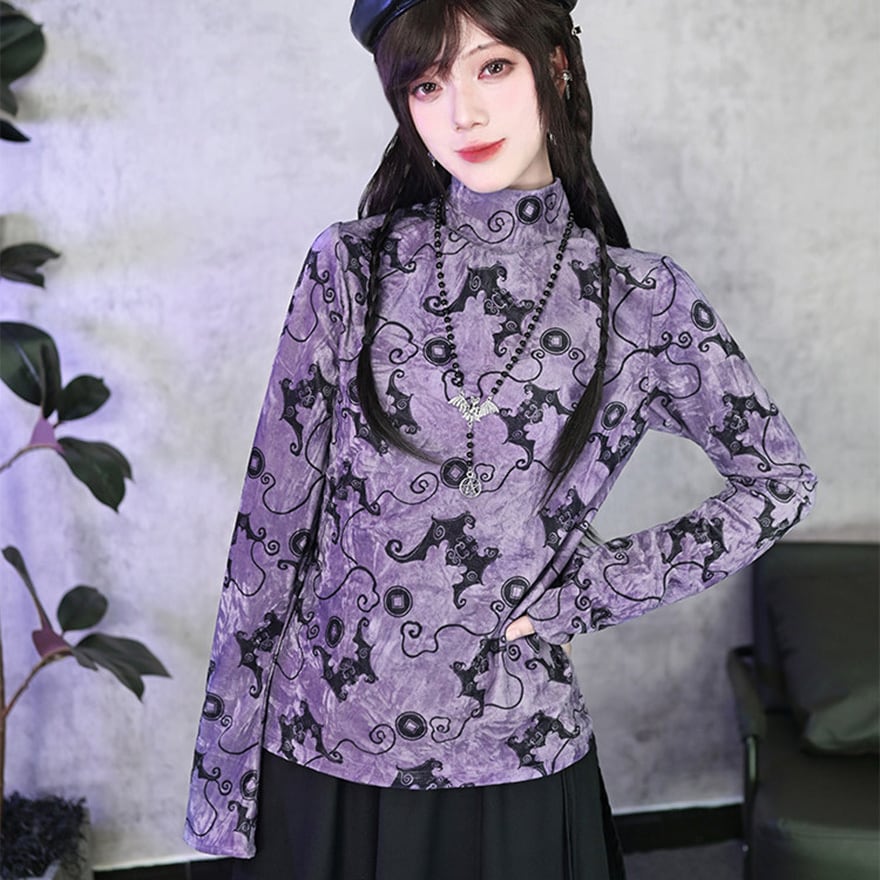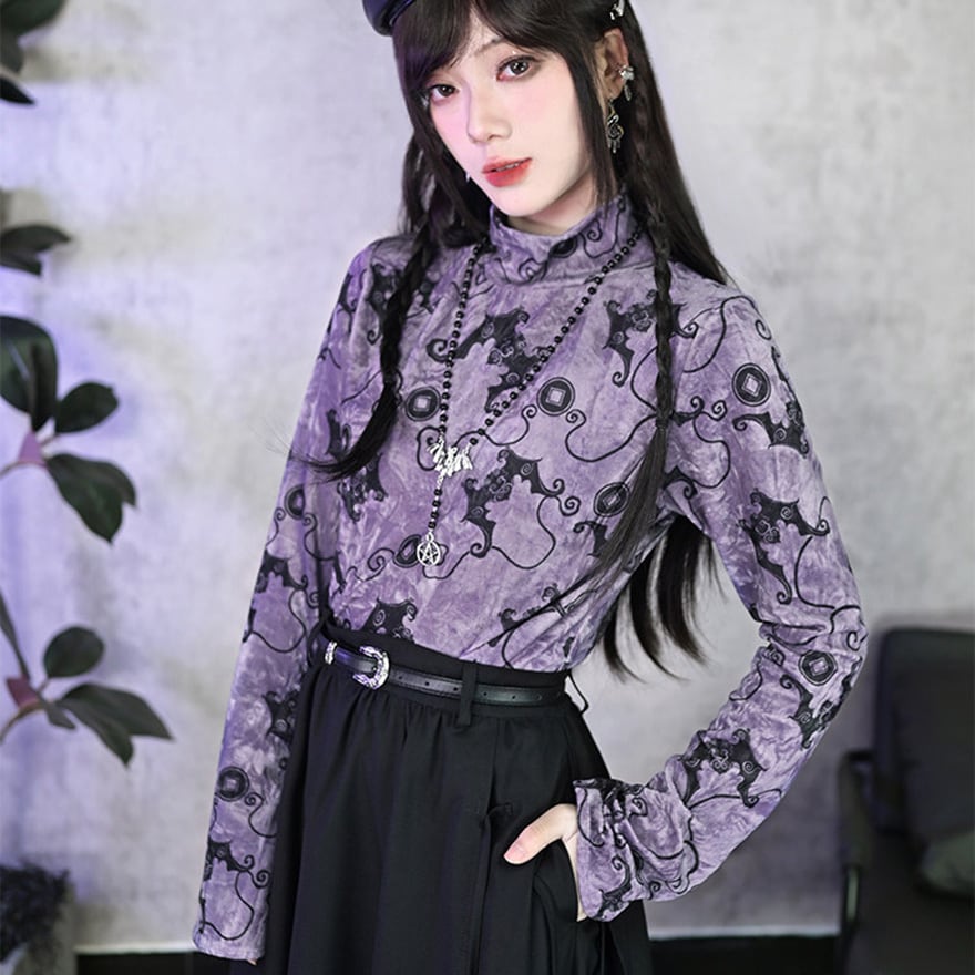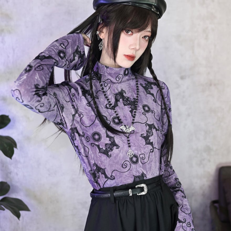 コウモリ柄のベルベット風素材が特徴で、ベルベットの光沢とパープルがエモすぎる最強映えなトップスです。