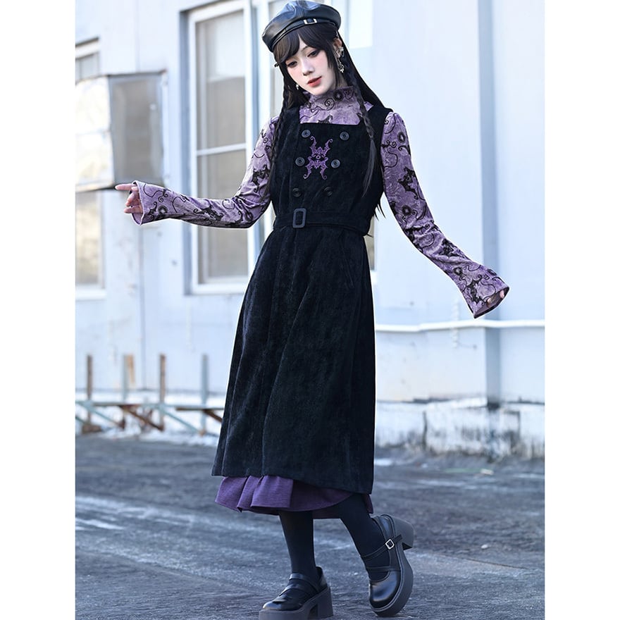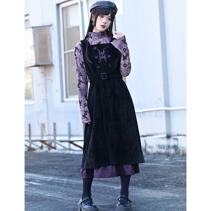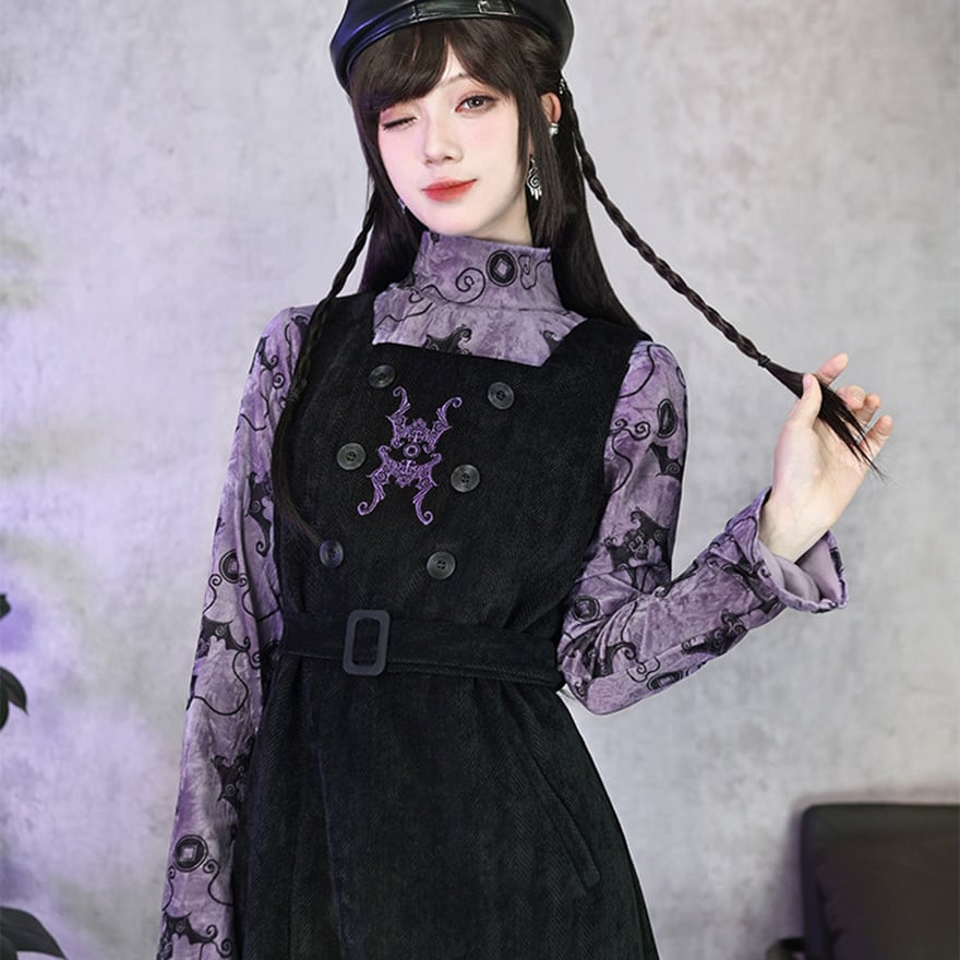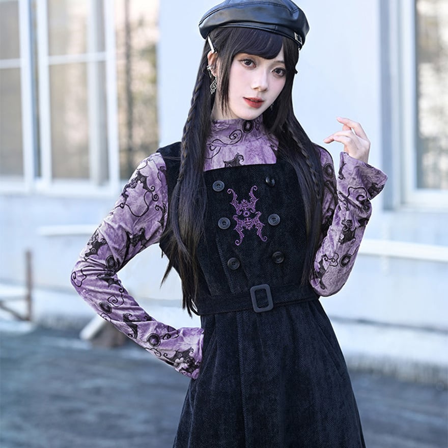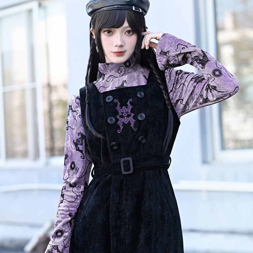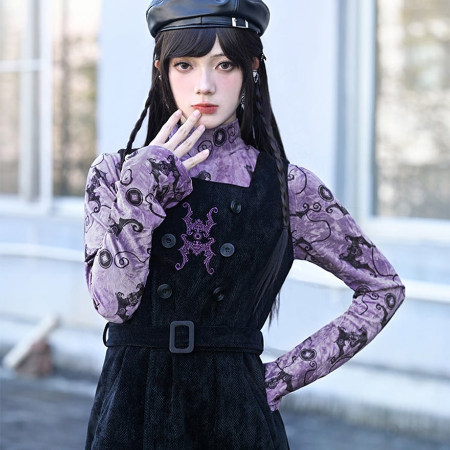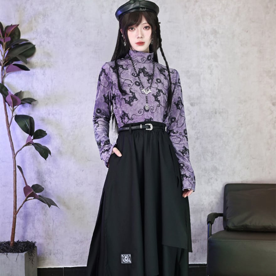 コウモリ柄のベルベット風素材が特徴で、ベルベットの光沢とパープルがエモすぎる最強映えなトップスです。