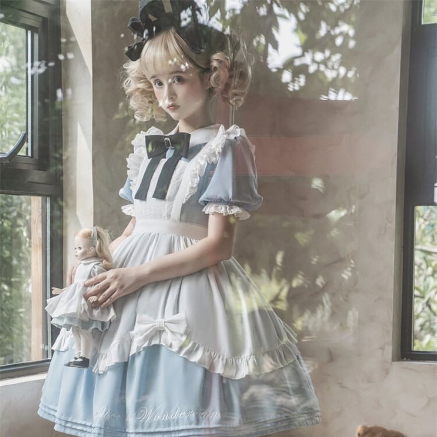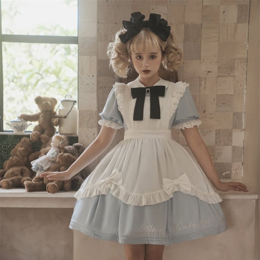 アリス風メイドワンピース エプロン付 水色 白 フリル ロリータファッション お茶会 イベント衣装|天使と悪魔