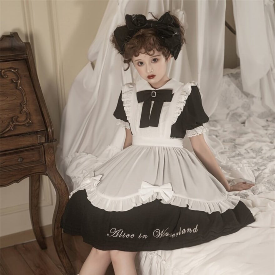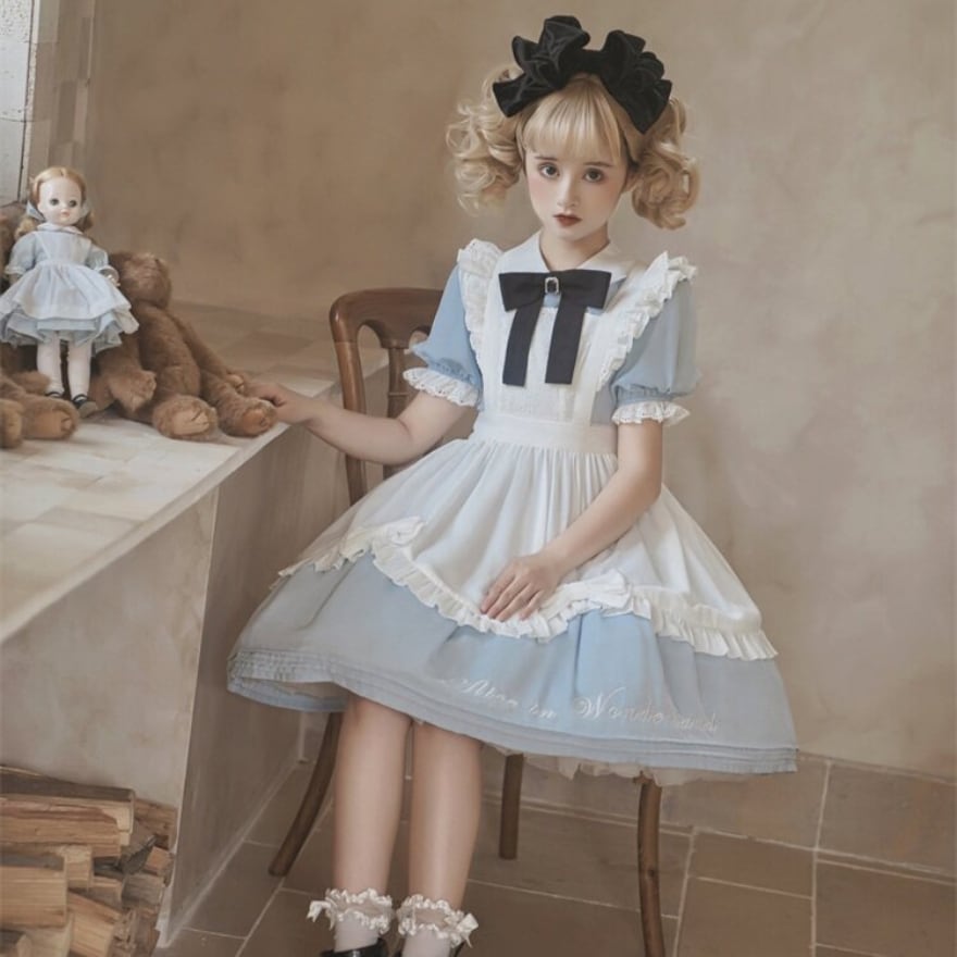 ボリュームたっぷりのフリルエプロンがセットになっており、お茶会やイベント、コンカフェでの衣装として圧倒的な可愛さを演出します。一枚で完成度の高いドールファッションを楽しめる、正統派ロリータスタイルを叶えるアイテムです。