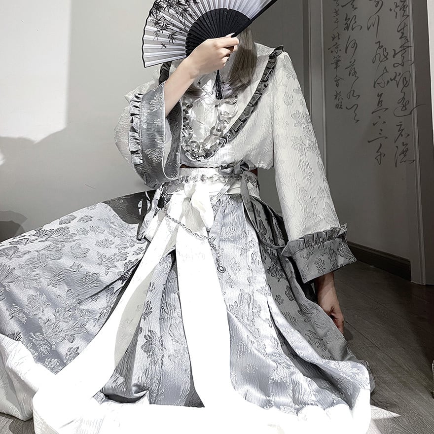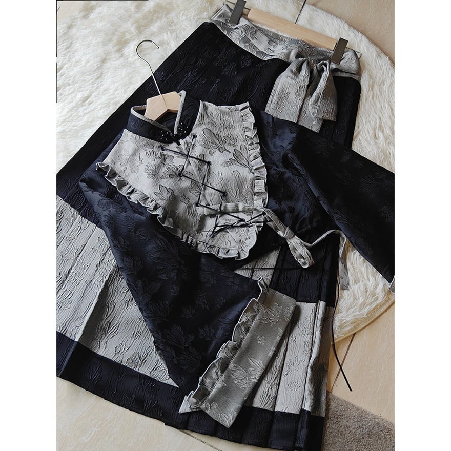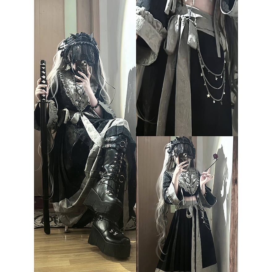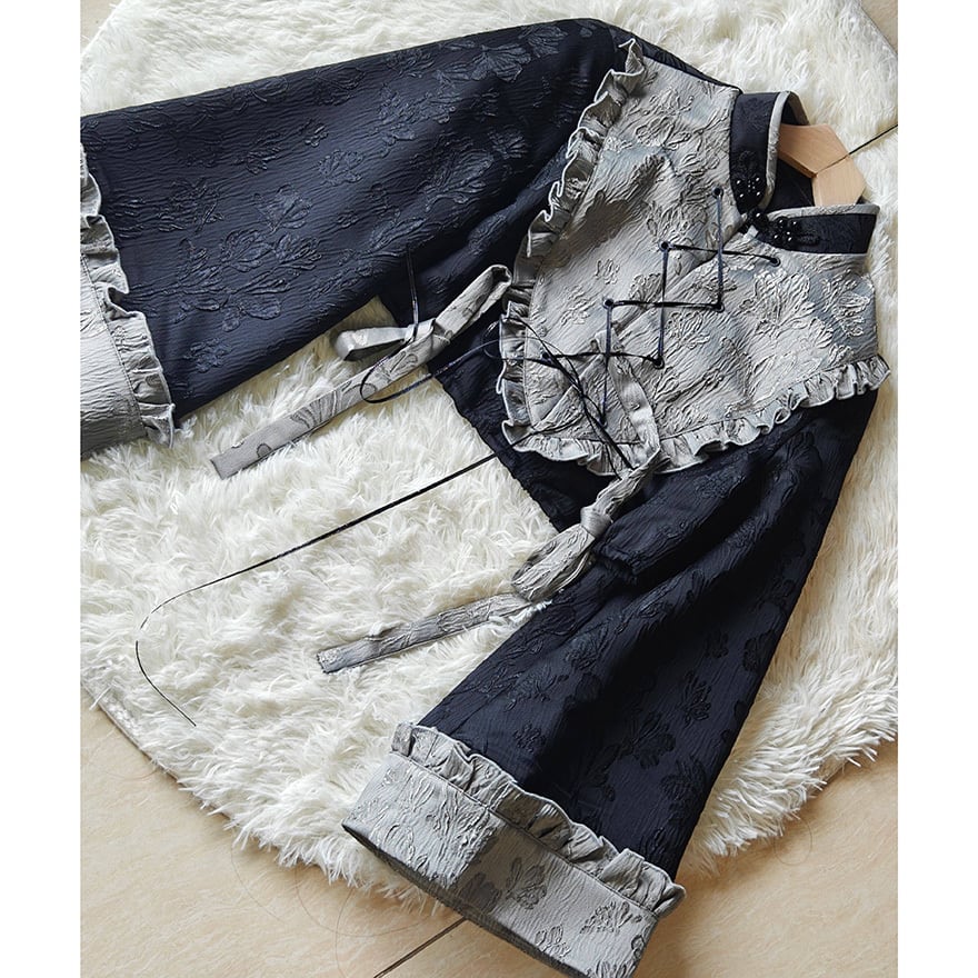 ◆デザインの特徴配色: 黒(ブラック)とグレー(灰色)のバイカラー 。テキスタイル: 光沢のあるジャガード織(竹の和柄文様)生地をスカート、袖口、襟元に使用 。シルエット: チャイナドレス風の立ち襟、フロントボタン、そして大胆なスリットが特徴 。ディテール: ウエストには調整可能なハーネス風ベルト、アクセサリー用のチェーン(星モチーフ付き)が付属。
