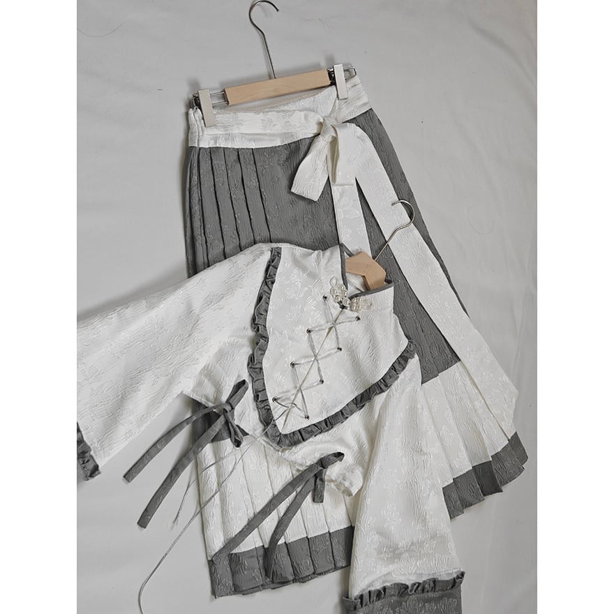 ◆世界観・ストーリー光沢のあるグレーのジャガード生地には、風にそよぐ竹の文様が織り込まれ、静かながらも確かな存在感を放ちます。深く静かな「黒」と、霧のような「グレー」のコントラストが、ダークでミステリアスな、まさに「病みかわ」な世界観を完成。エッジの効いたハーネス風のベルトや、大胆なスリットが、甘さを排除した「強めのサブカル」スタイルを叶えます。これを纏えば、誰もが振り返る、あなただけの物語が始まります。