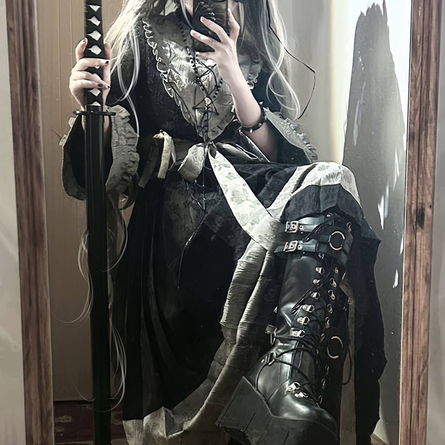 ◆こんなシーンにライブ参戦・コンカフェイベント: 「強め」のビジュアルで、チェキ映え、ステージ映え間違いなし 。TikTok・Instagram投稿: 独特の世界観はSNSでの「沼落ち」確定 。撮影会・作品撮り: 刀や扇子などの小物がよく映える、ドラマチックな一着。推し活・オフ会: メンカラ(黒・グレー)を取り入れた個性派コーデに。