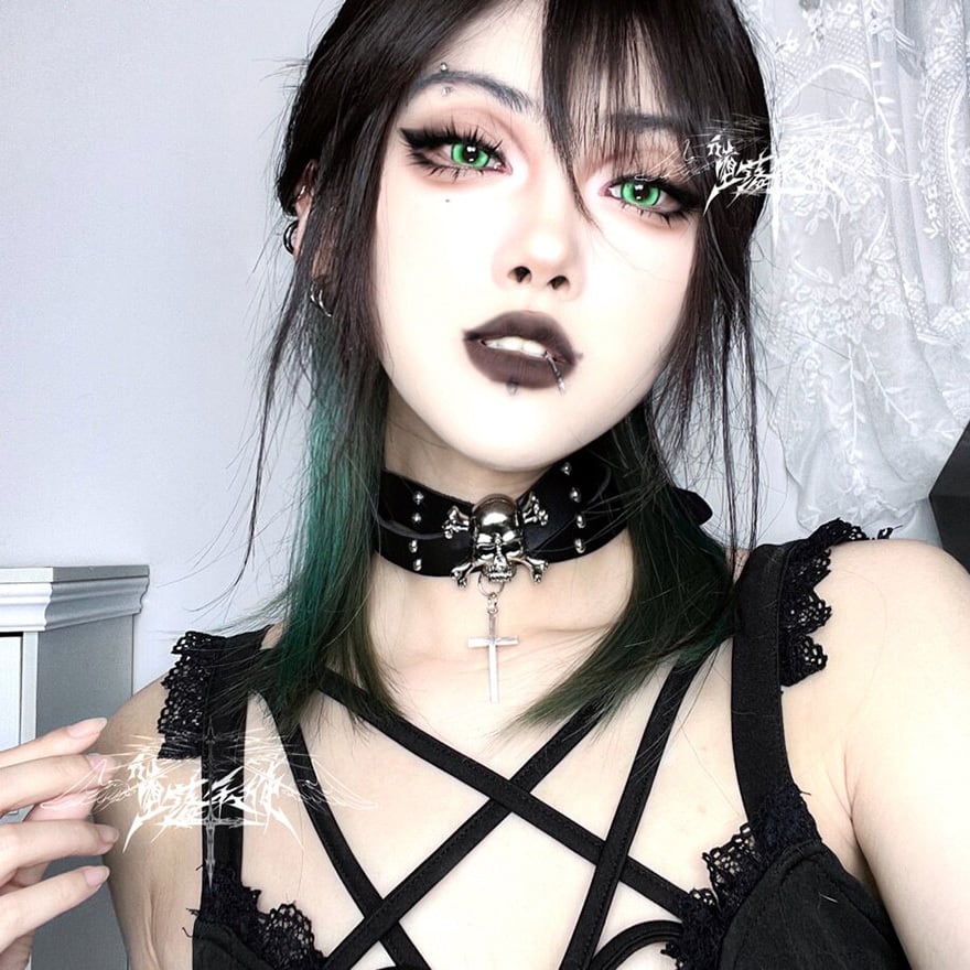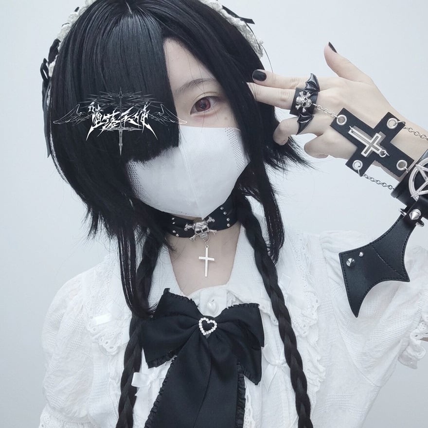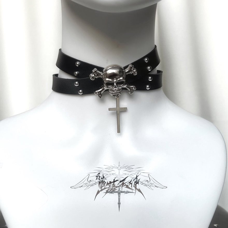 大きなスカルと十字架のチャームが特徴で、パンクや地雷系コーデに最適です。