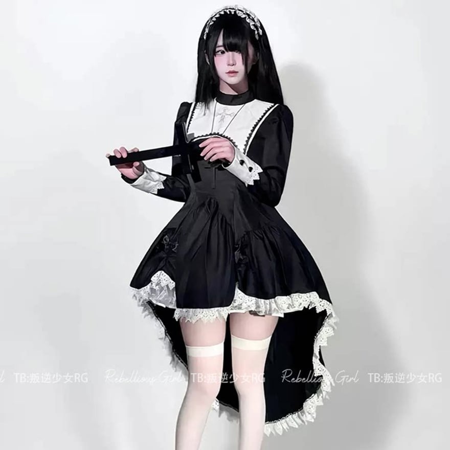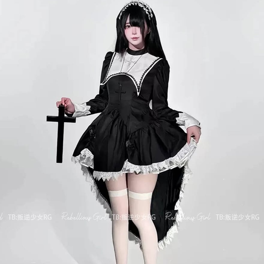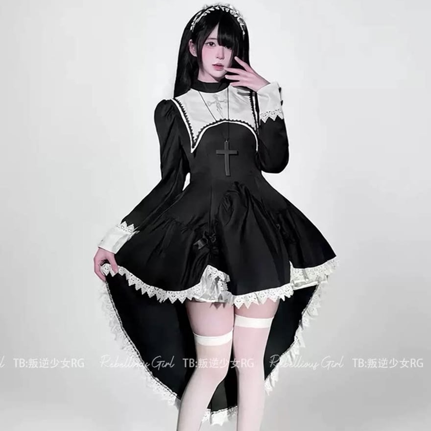 天使と悪魔のゴシックワンピースは、修道女風のデザインとフィッシュテールが特徴で、コンカフェ衣装に最適です。