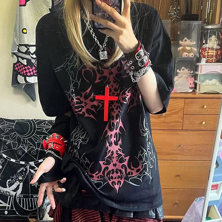 ・柄:フロント中央に大きく配置された、緻密で鋭利なトライバル調の十字架グラフィック