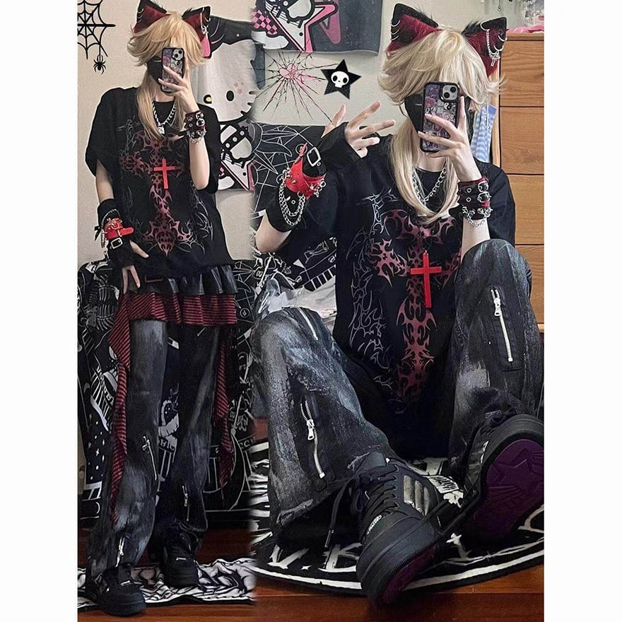 闇の中に浮かび上がる赤い十字架が、退廃的でありながら強い意志を感じさせるサブカル全開なスタイルを完成させます。