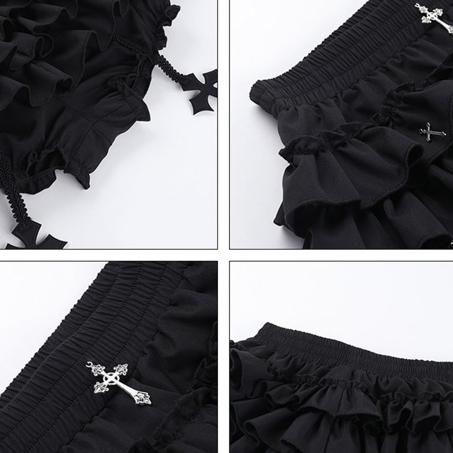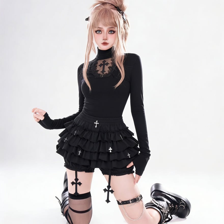 十字架レースとフリルが特徴のゴシックな病み可愛いセットアップです。