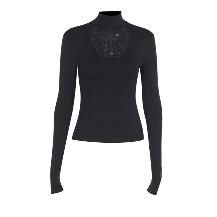 ・トップス:ハイネックに長袖、胸元には十字架を象った繊細なレースの窓あきデザイン