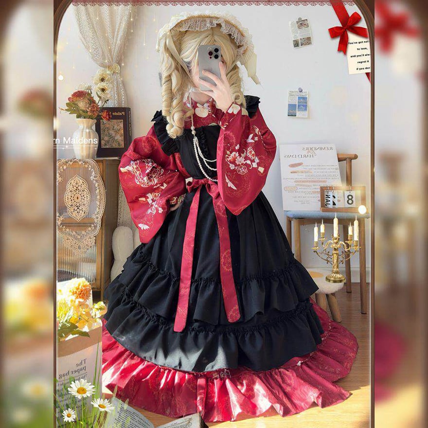 着物のような袖とフリルたっぷりのスカートが特徴で、撮影会やイベントに最適です。
