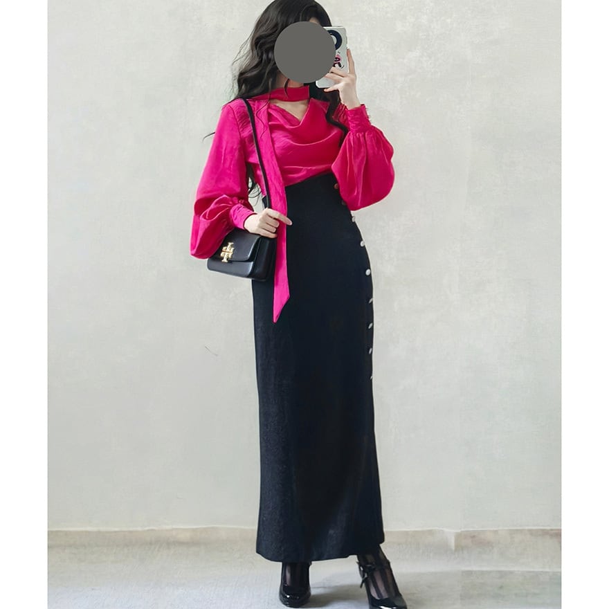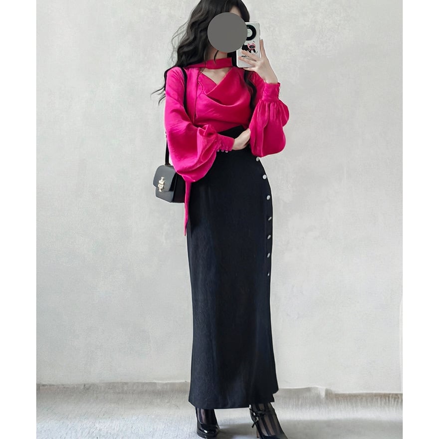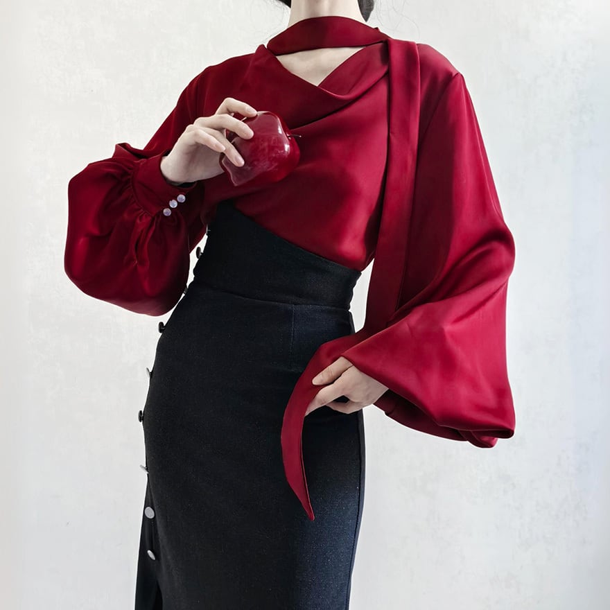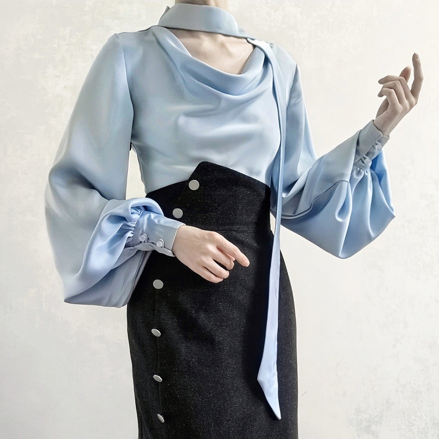 艶やかなサテン生地と優雅なバルーンスリーブが特徴で、特別な日の装いに最適です。