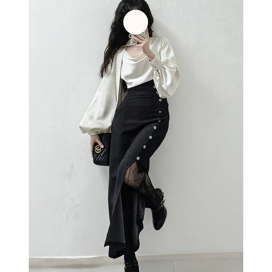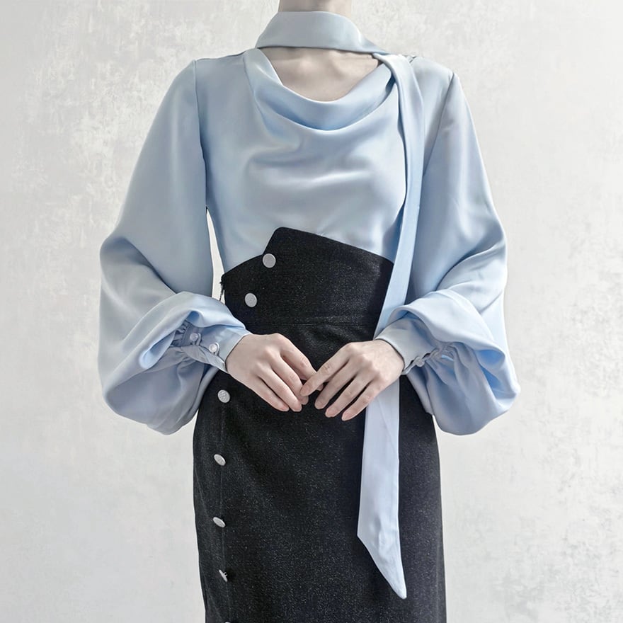 動くたびにバイアスカットされた生地がしなやかに体に沿い、ボリュームのある袖が手元を華奢に見せてくれます。