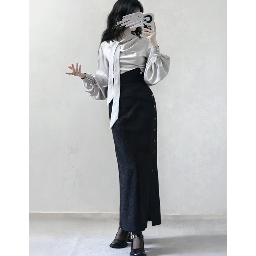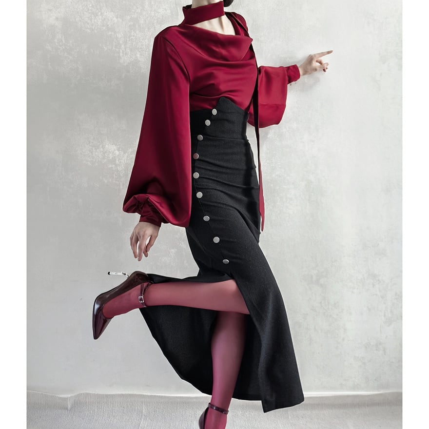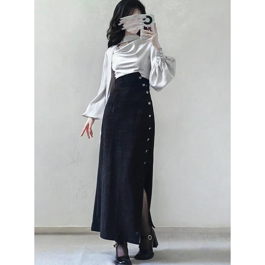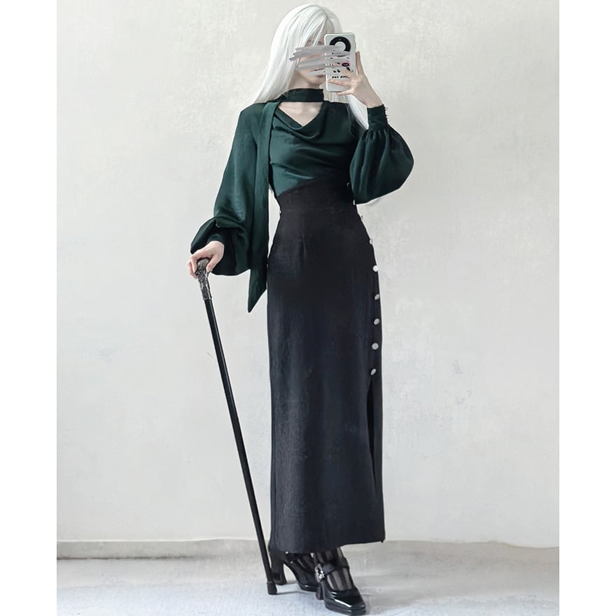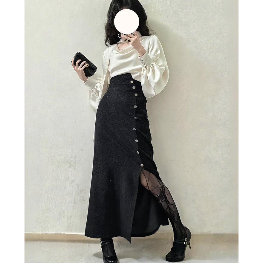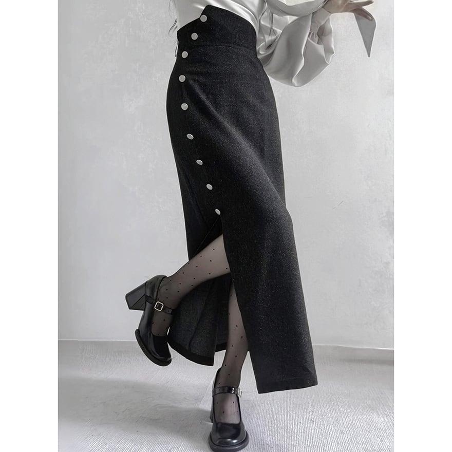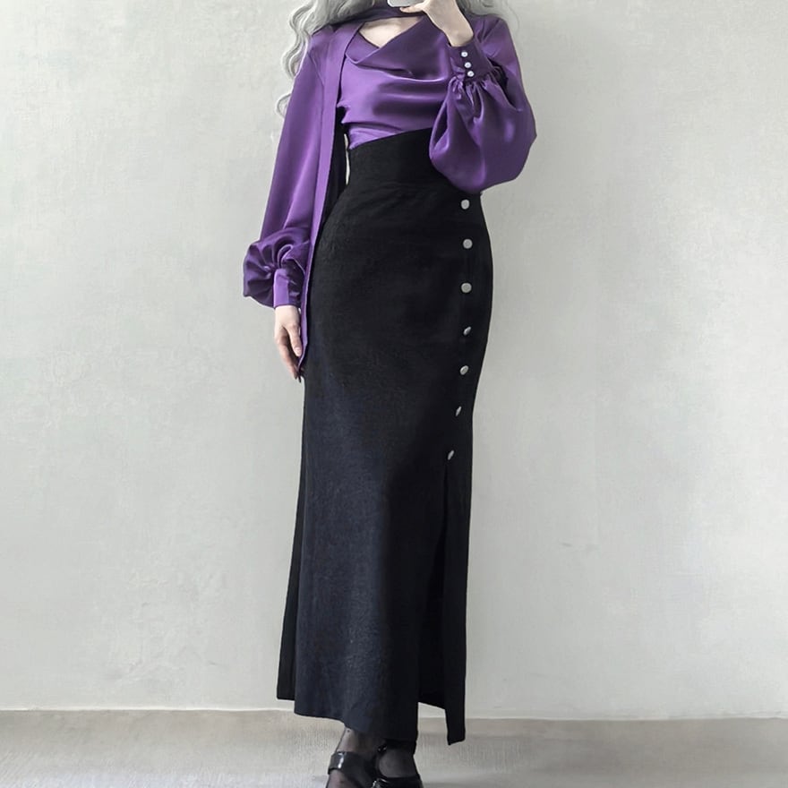 モード系 スリットスカート ハイウエスト サイドボタン ロング丈 撮影会 推し活 黒|天使と悪魔