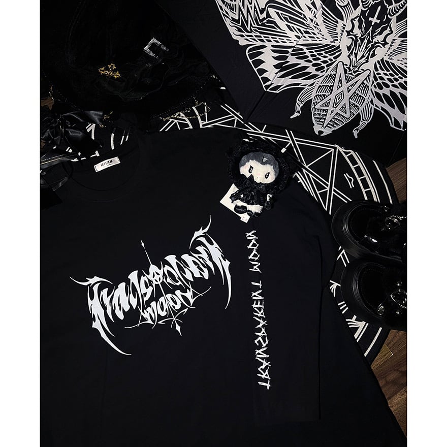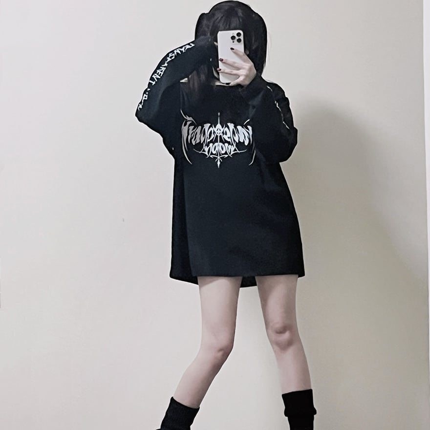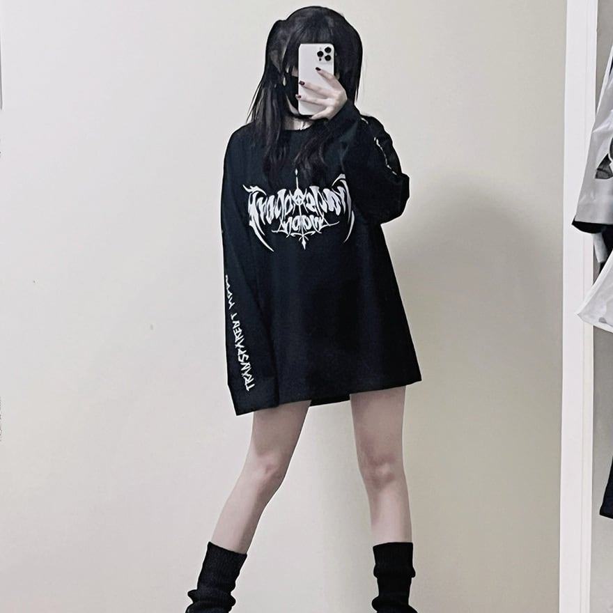 ダークなグラフィックが特徴で、地雷系コーデに最適なロングTシャツです。