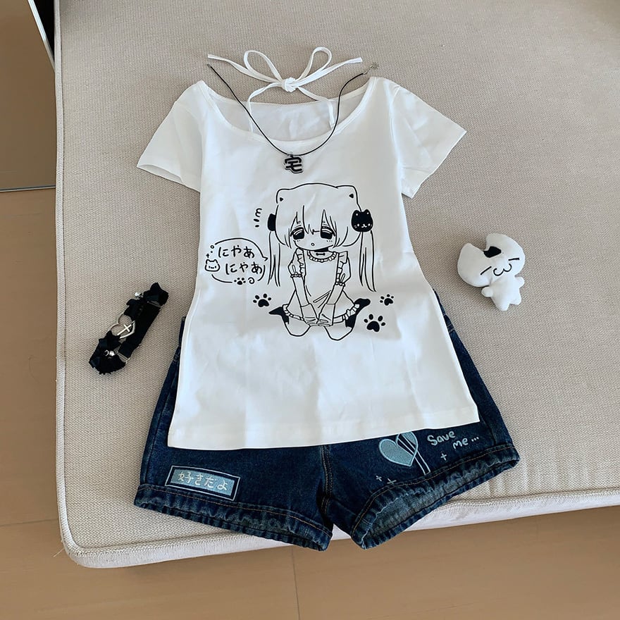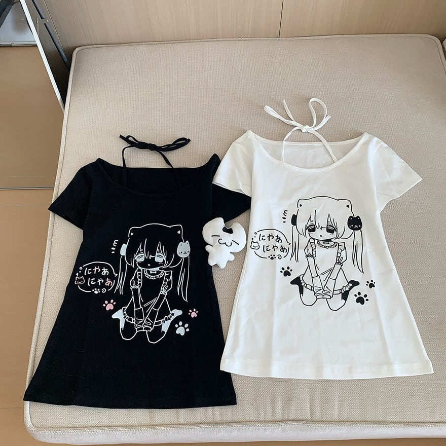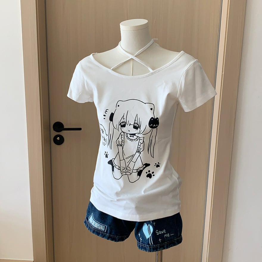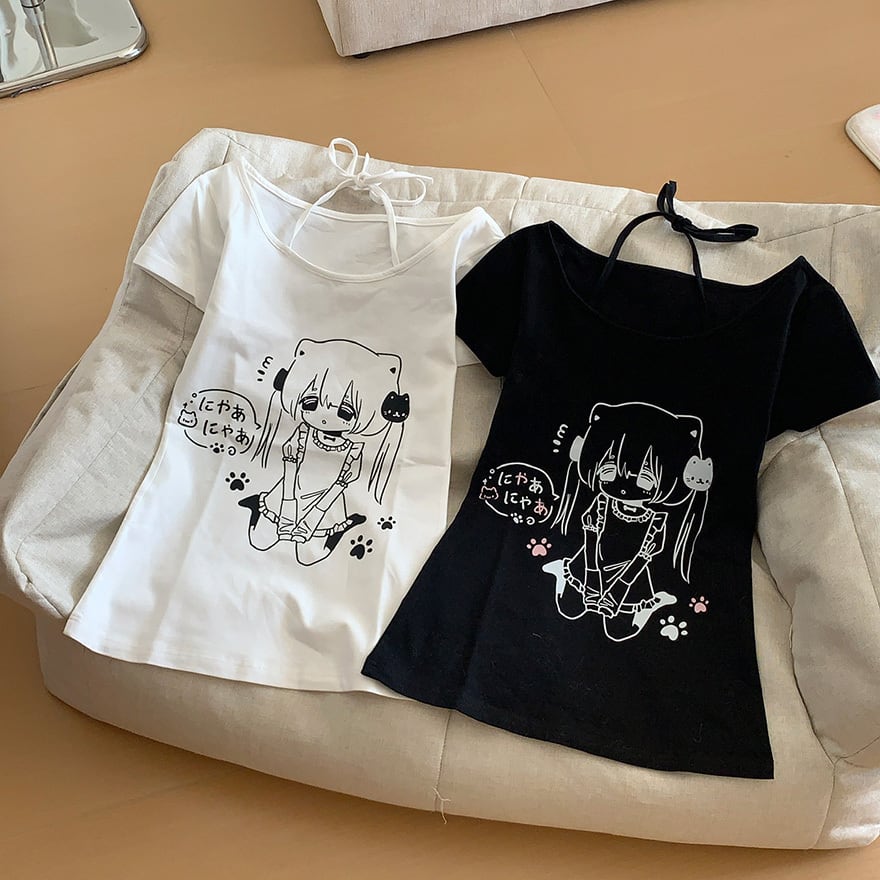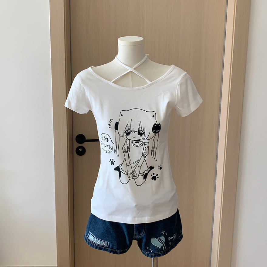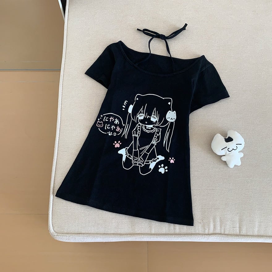アニメ風の萌えプリントとホルターネック風のリボンがかわいいメンヘラ夏Tです。