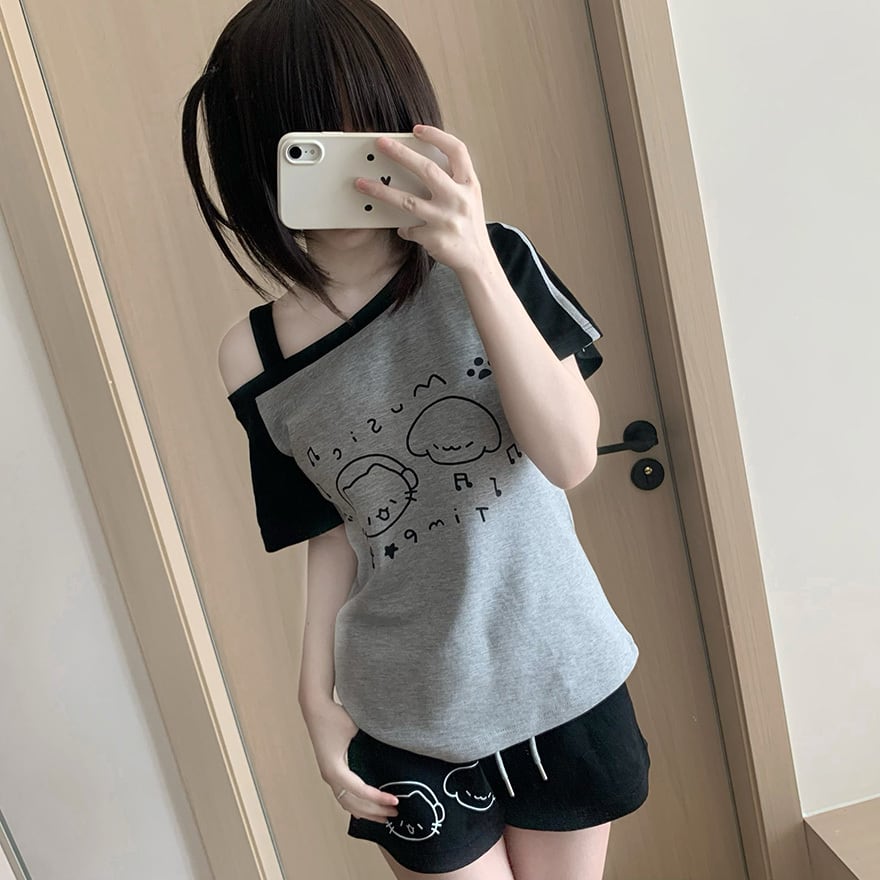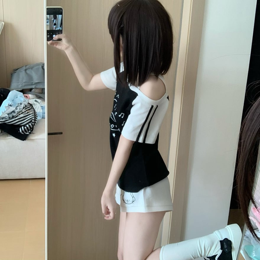 「バンドエイドを貼ったキャラと音符の組み合わせ、ぴえん界隈のユーザーが探しているのはこの温度感だと思います。オフショルだけどストラップ付きで、ズルッと落ちすぎない安心感も沼落ちポイント。」