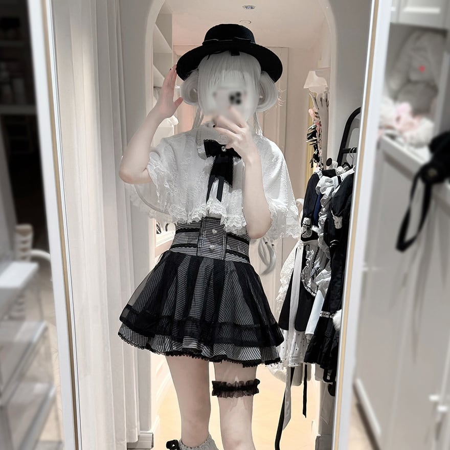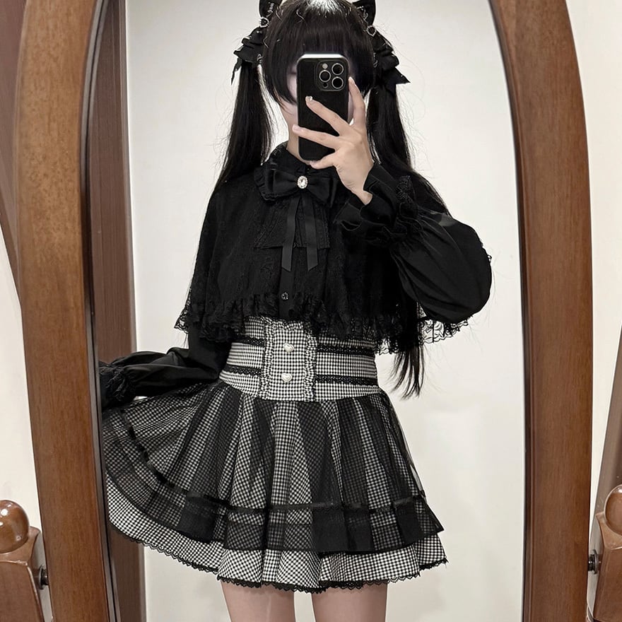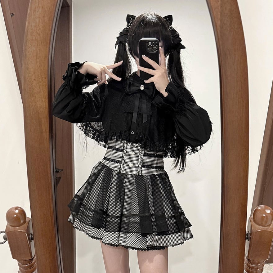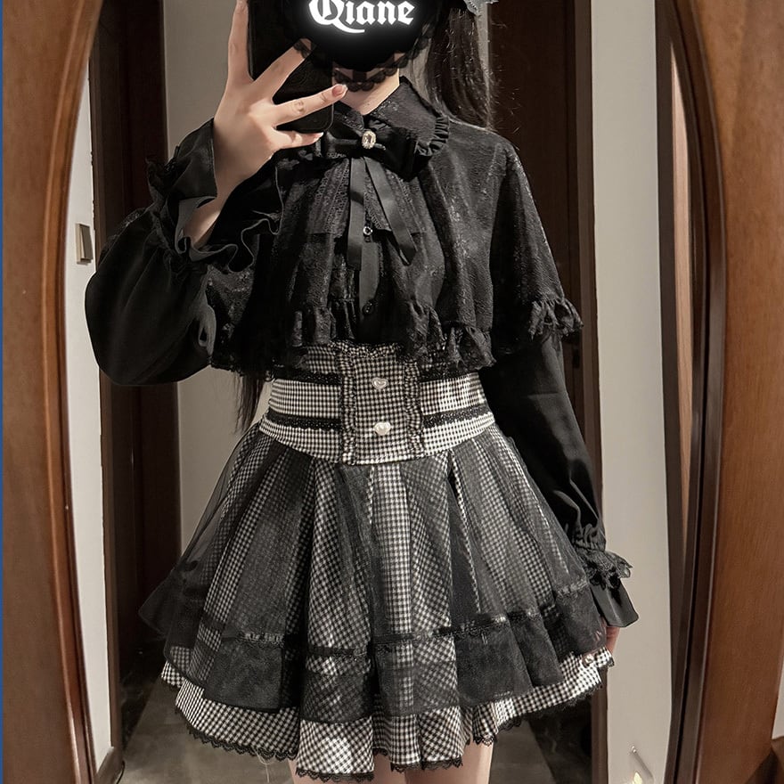黒千鳥格子と段フリルレースが特徴で、推し活やライブ参戦に最適な地雷系ミニスカです。