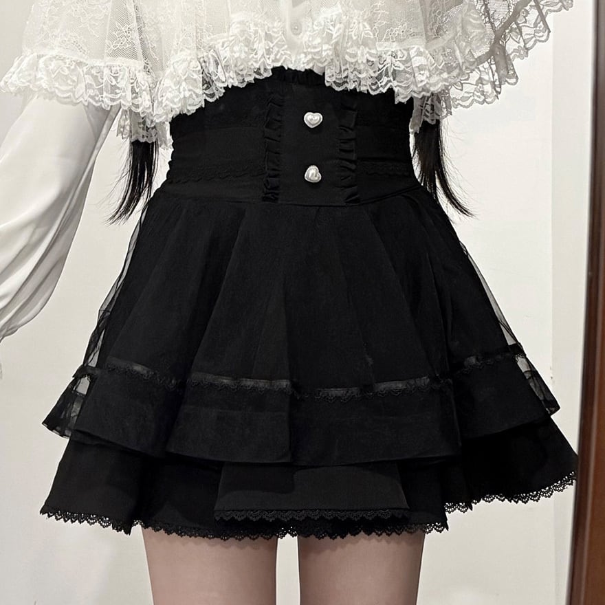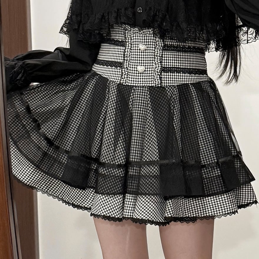 沼落ち確定の可愛さ 地雷系ミニスカ 黒千鳥格子 段フリル ハイウエスト 映え