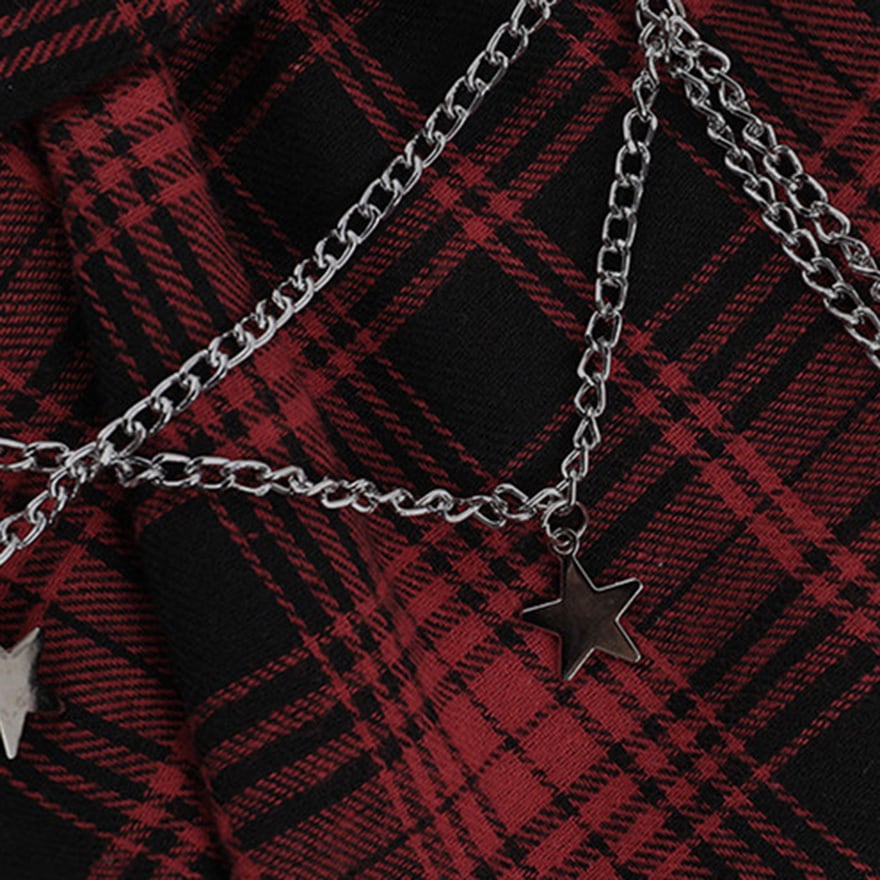 「赤黒チェックの強めな配色に、星チェーンとレースの甘辛バランスが絶妙です!特に非対称な裾のデザインはシルエットが綺麗で、個性を出したいぴえん界隈のユーザーさんに刺さる温度感だと思います。」