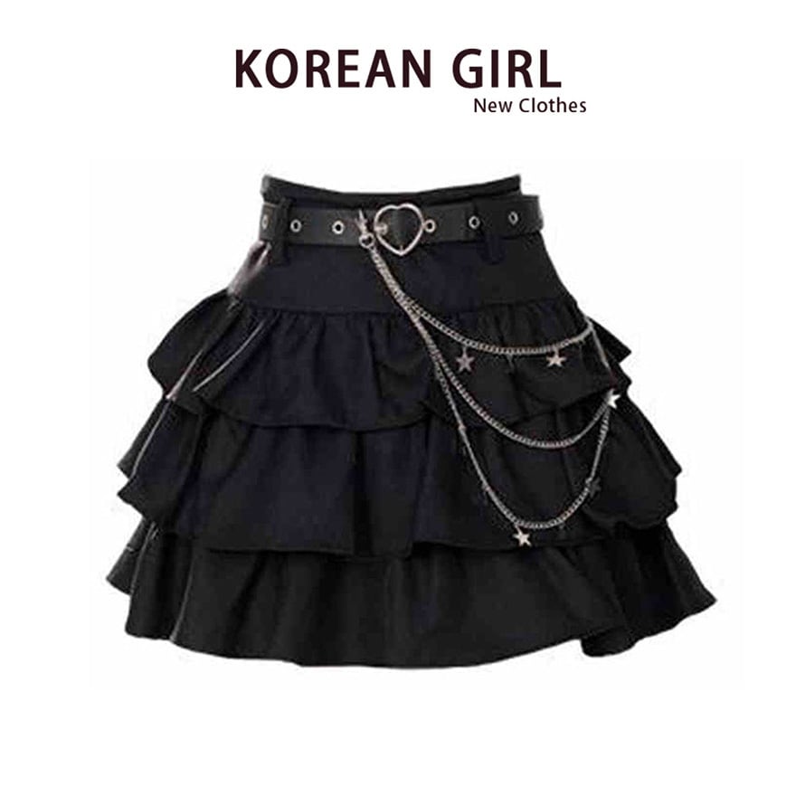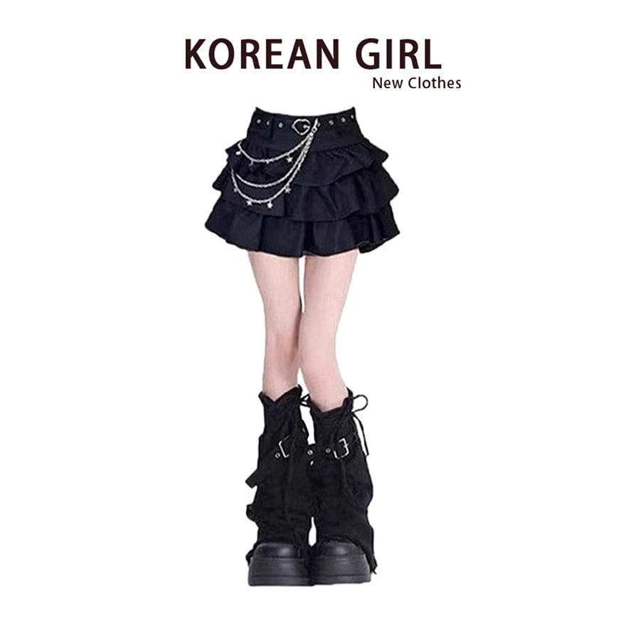 地雷系ファッションのチェーン付きティアードミニスカート&レッグウォーマーセット