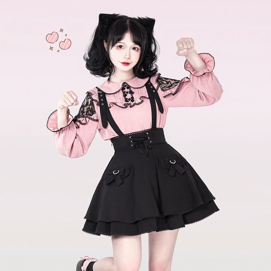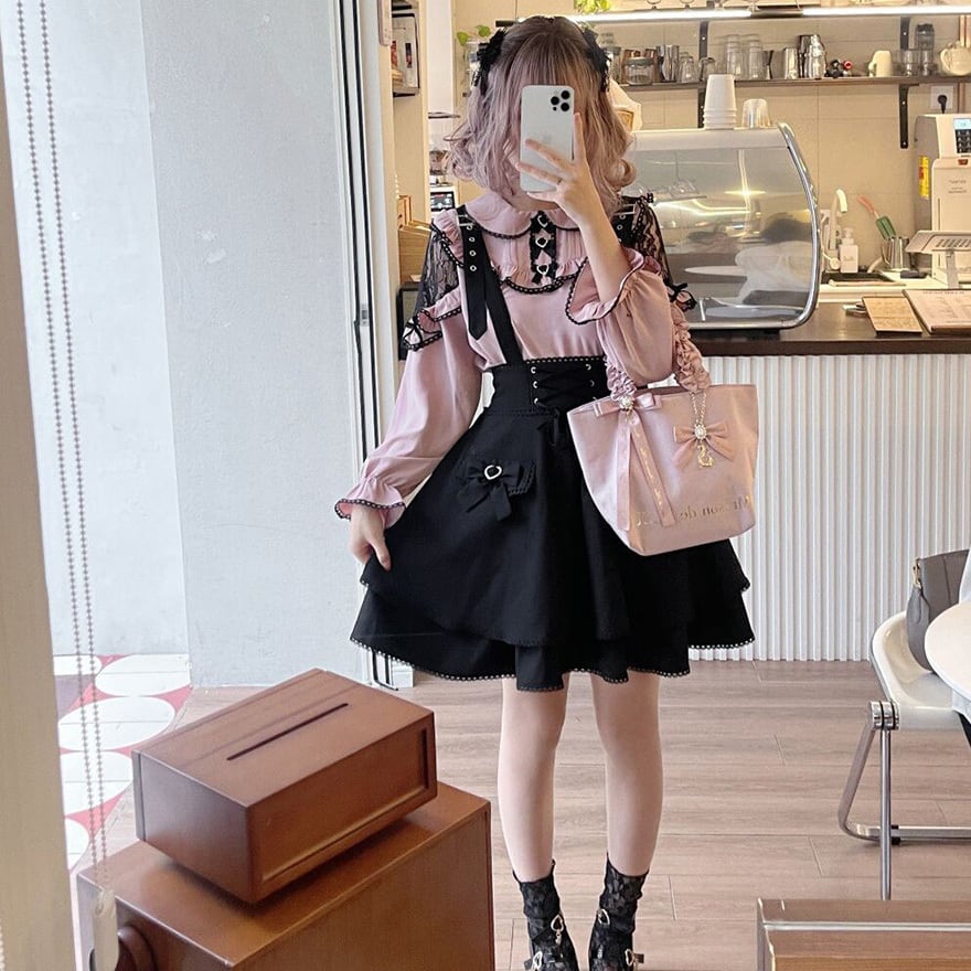 肩出し ピンク×黒リボン ライブ映えな量産型ブラウス