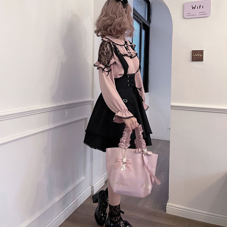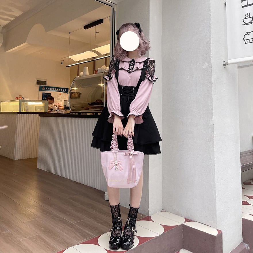 肩のラインを華奢に見せるオープンショルダーと、襟元の繊細なフリル、そしてコントラストの効いた黒リボンが、甘さと地雷感の絶妙な温度感を生み出します。