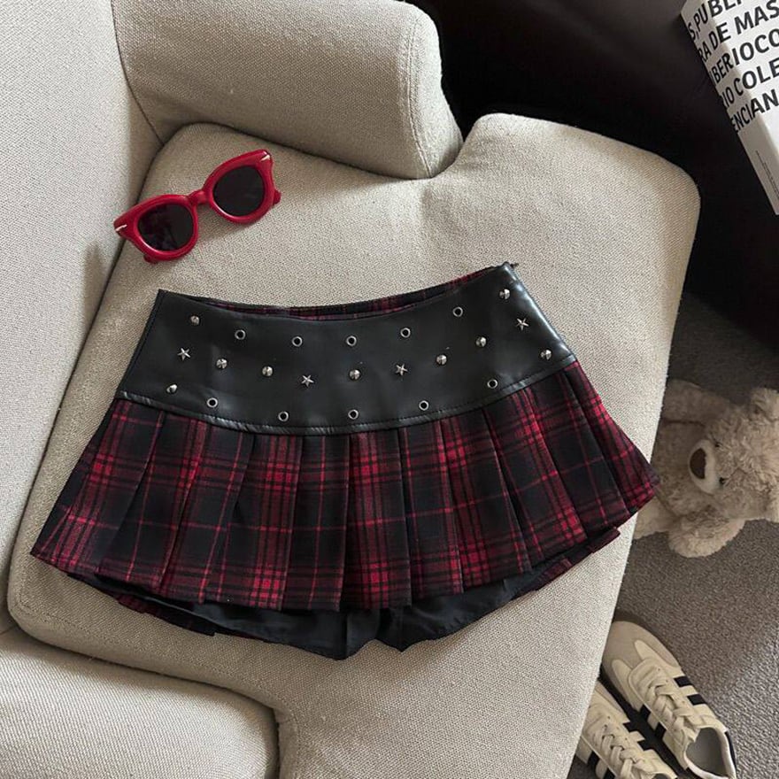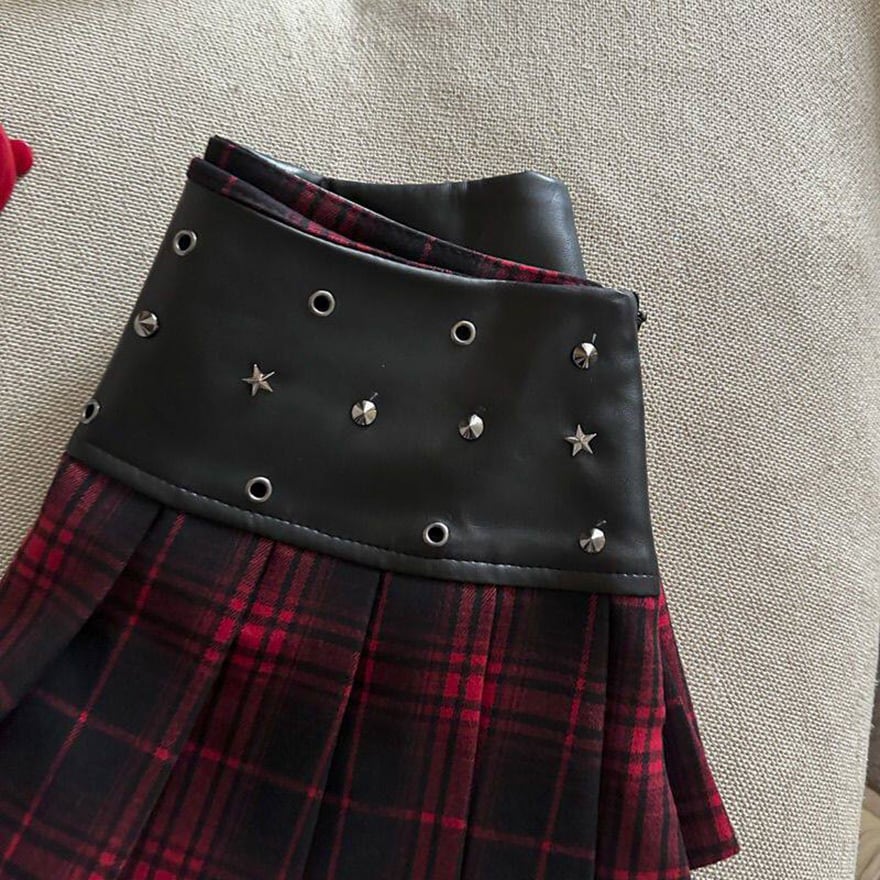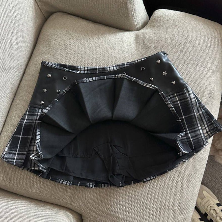 地雷系ファッション スタッズ付きチェックプリーツミニスカート