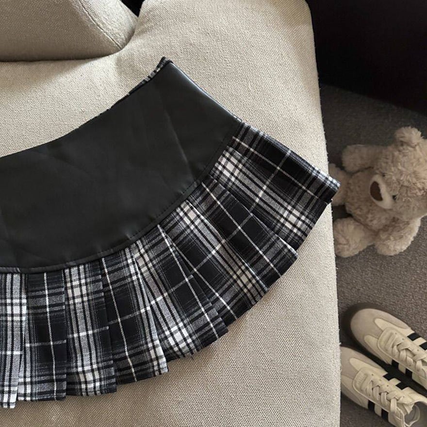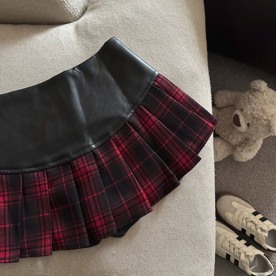 チェック柄のプリーツとウエストのスタッズ付き合皮切り替えが特徴で、ライブ参戦やイベント衣装に最適です。