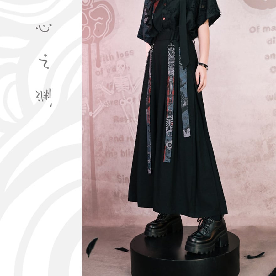 動きに合わせて揺れるロング丈と装飾ベルトが存在感を引き立て、シンプルなトップスと合わせるだけで世界観のあるスタイリングが完成します。
