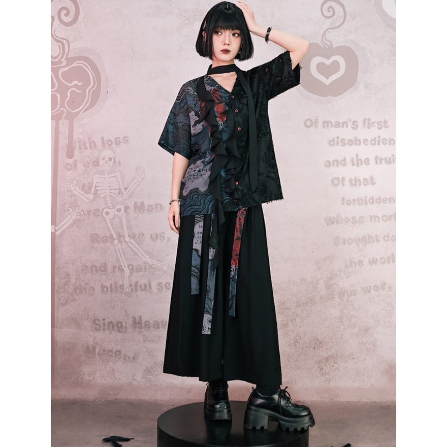 サブカル系ファッションの柄切替デザインワイドパンツ