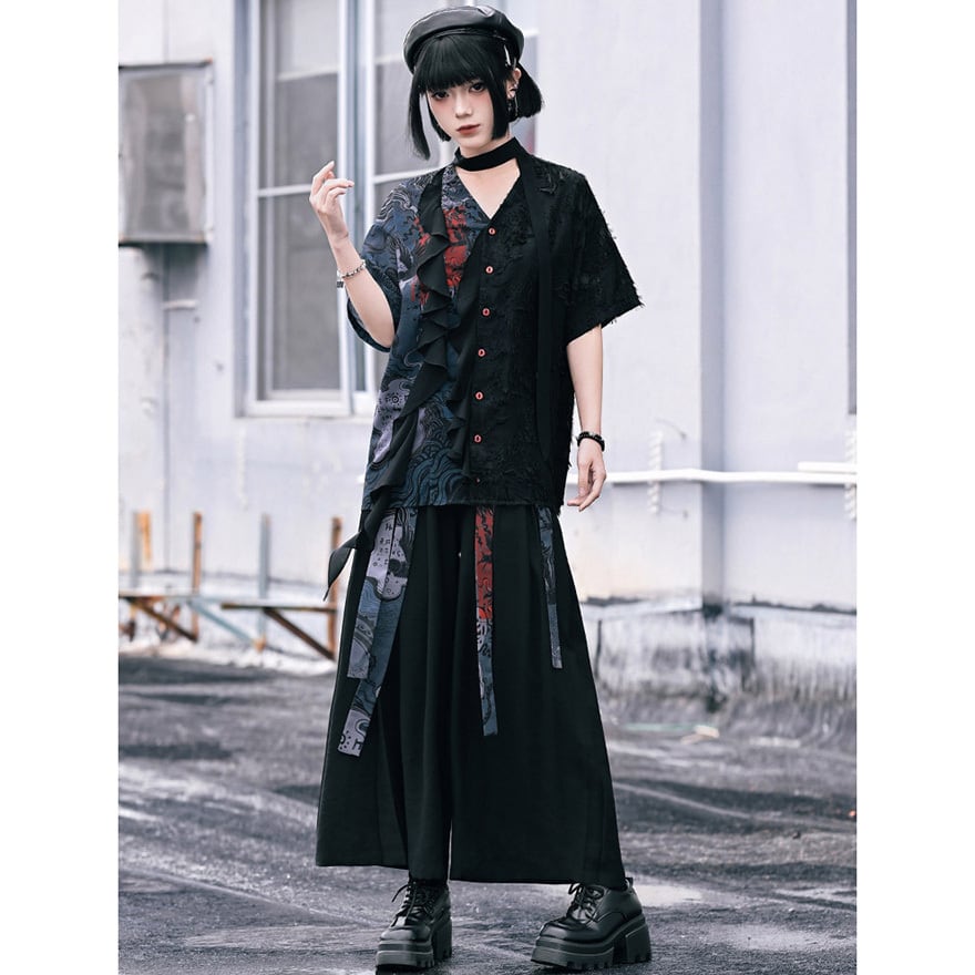 柄切替デザインとゆるシルエットが特徴で、推し活やTikTok映えコーデに最適な中華風ワイドパンツです。